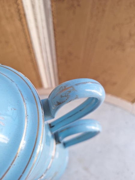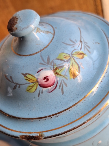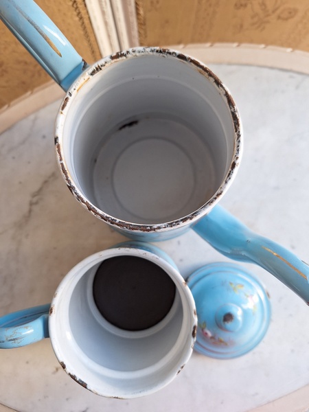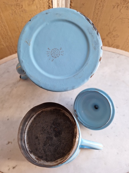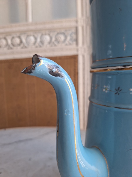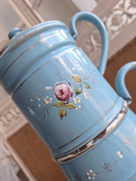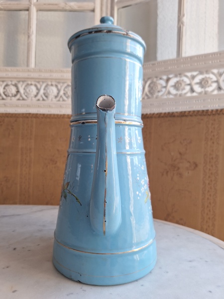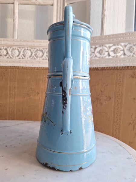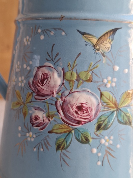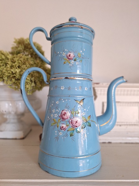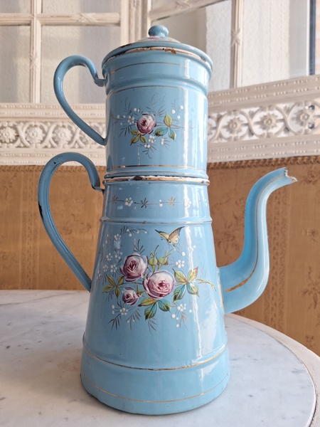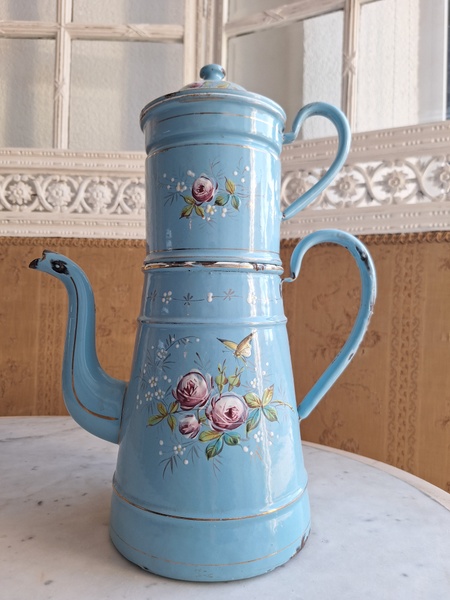 エトワール社手描きコーヒーポットです。大き目のビギンです。フィルターにも柄が入って華やかです。柄は綺麗に残っていて艶があり綺麗な状態です。ホーローの小さな剥がれは所々ありますが目立った場所にはないので飾っていただくと存在感のあるポットですよ。フランス製