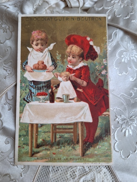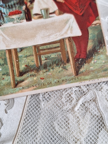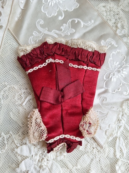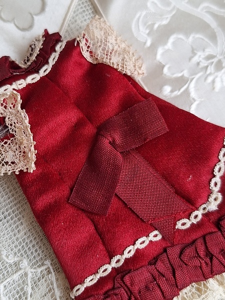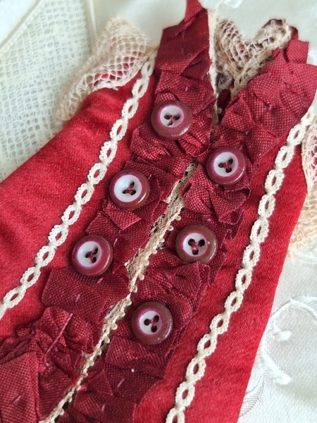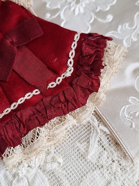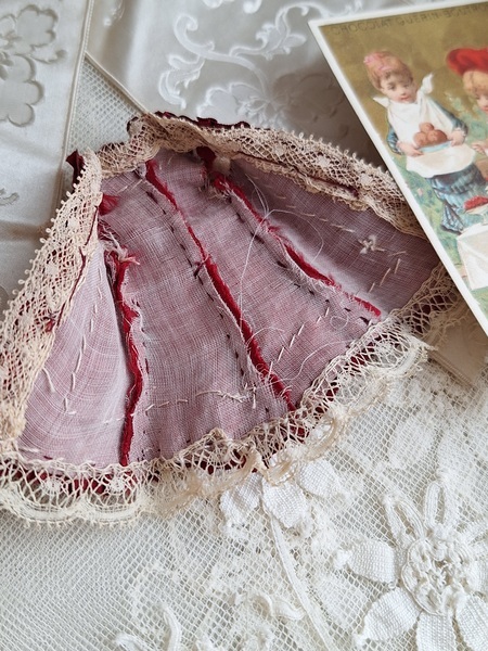 アンティークミニョネットドレスです。アンティーク素材を使ったフランスの作家様の作品です。ガラスの小さなボタンも大変古い物でこの赤いドレスに似合っていますね。こんなに小さなドレスですが大きな子のドレスより高いんです。でもこの繊細な造りとこだわった素材感に一目惚れしました。お値段がアップしましたのでカードをお付けします。ちょうど手持ちの物で赤いドレスを着た子のカードがありましたのでお揃いみたいで可愛いです。フランス