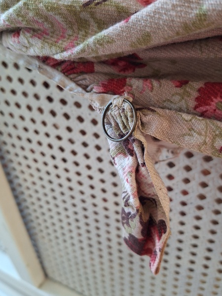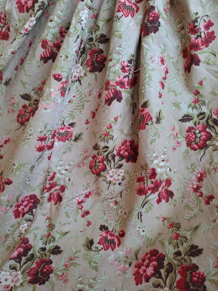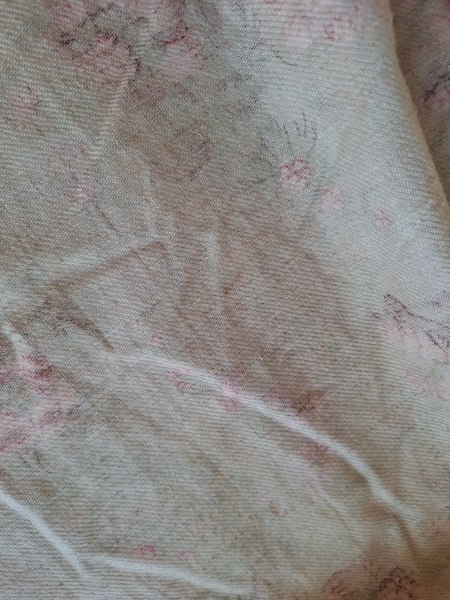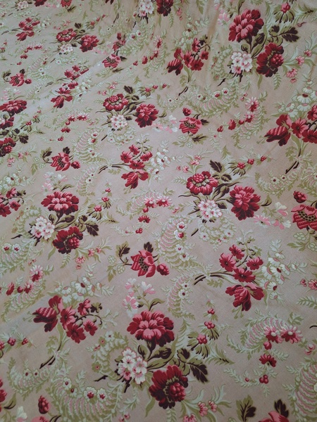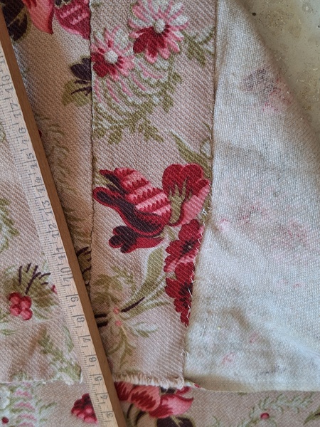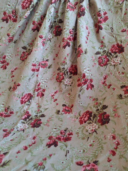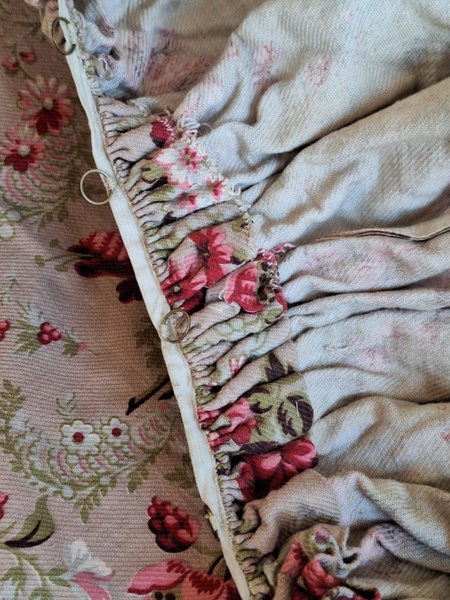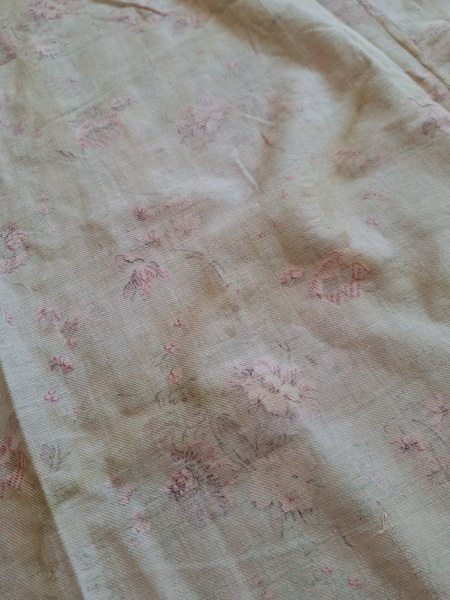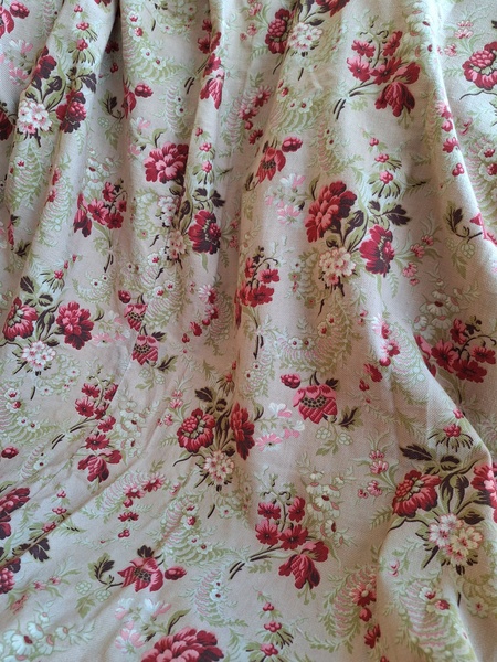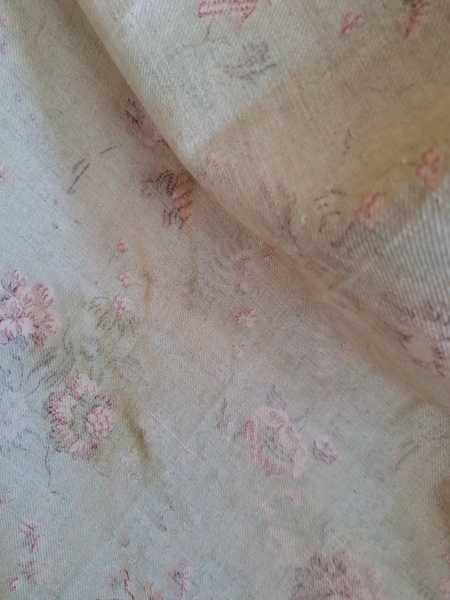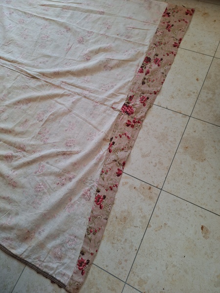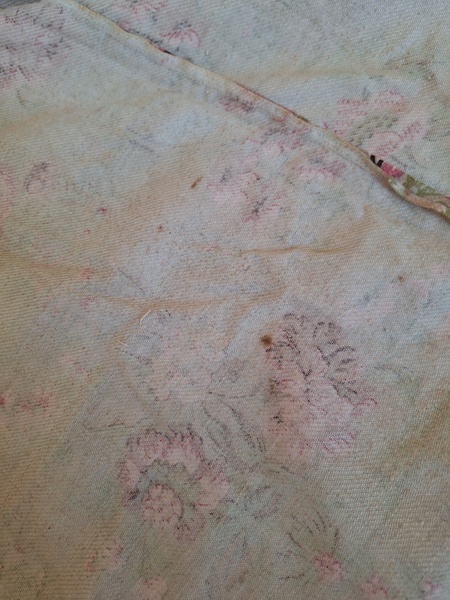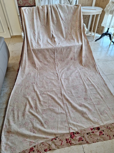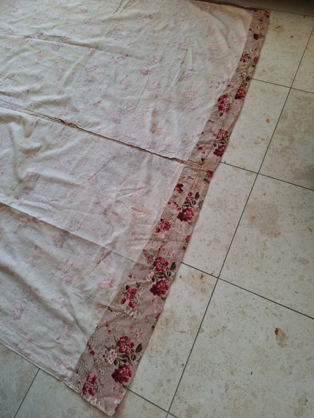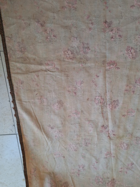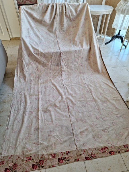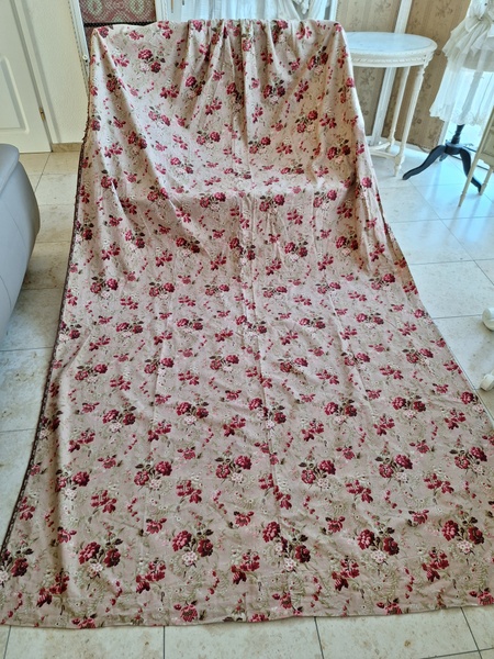 フレンチ花柄カーテンです。全体的に花柄が入った可愛いカーテンです。2枚のパーツをつなげて1枚のカーテンにしています。上部の絞っている箇所は幅が56センチ程度、裾は167センチあります。比較的厚手の生地です。長めのカーテンなので日本でカーテンとして使われる場合はサイズ調整していただいた方が良いかと思います。たっぷりあるのでクッションカバーなどのリメイクにも向いています。裏に汚れが見られますが厚手なので表からは分かりません。裾のほつれを補修した箇所はありますが痛みは無く良い状態と思います。フランス製