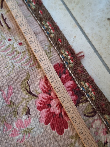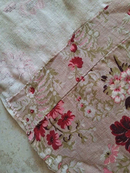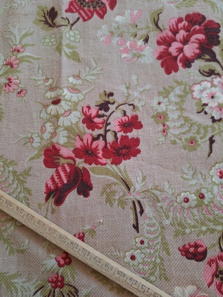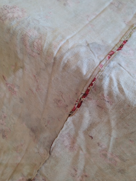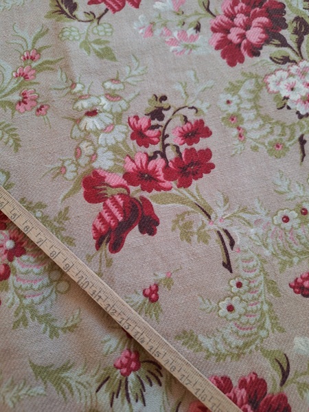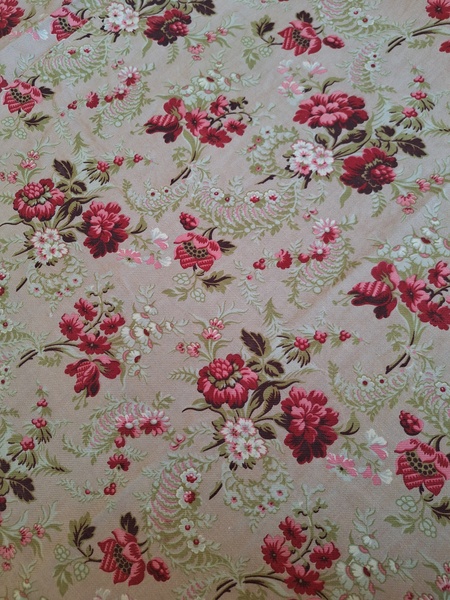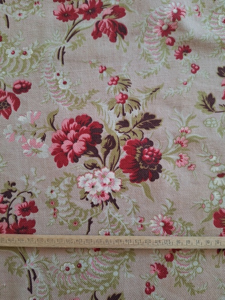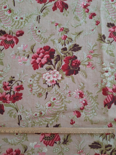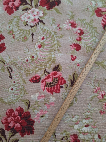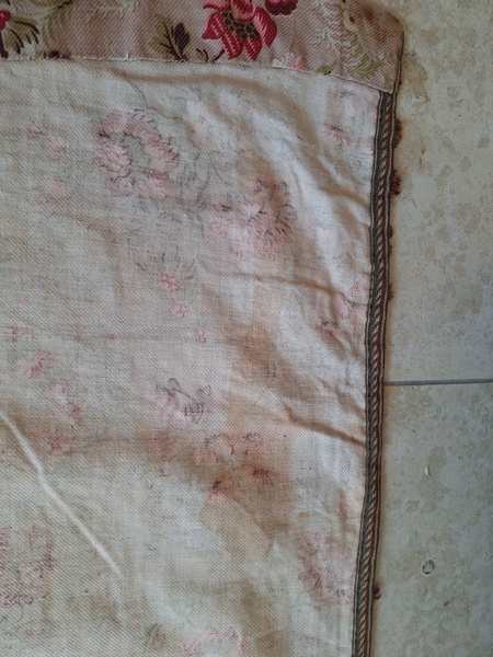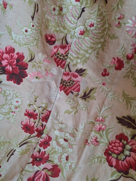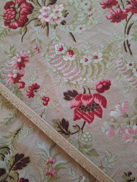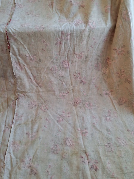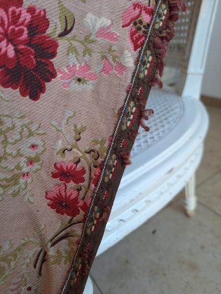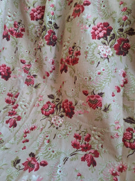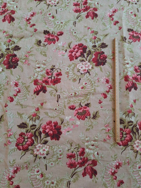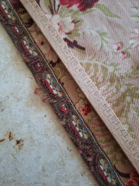フレンチ花柄カーテンです。全体的に花柄が入った可愛いカーテンです。2枚のパーツをつなげて1枚のカーテンにしています。上部の絞っている箇所は幅が56センチ程度、裾は167センチあります。比較的厚手の生地です。長めのカーテンなので日本でカーテンとして使われる場合はサイズ調整していただいた方が良いかと思います。たっぷりあるのでクッションカバーなどのリメイクにも向いています。裏に汚れが見られますが厚手なので表からは分かりません。裾のほつれを補修した箇所はありますが痛みは無く良い状態と思います。フランス製