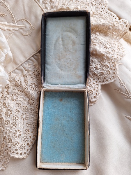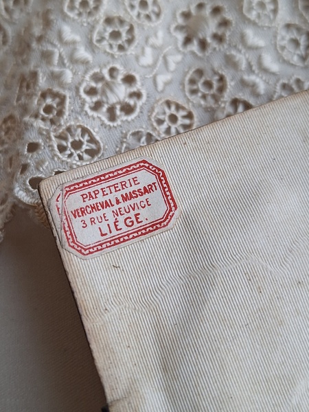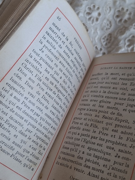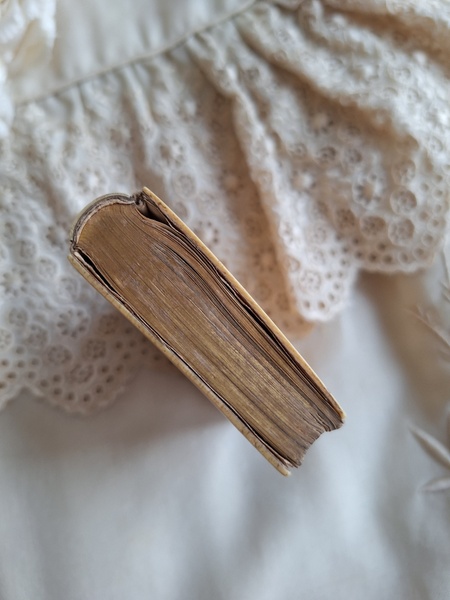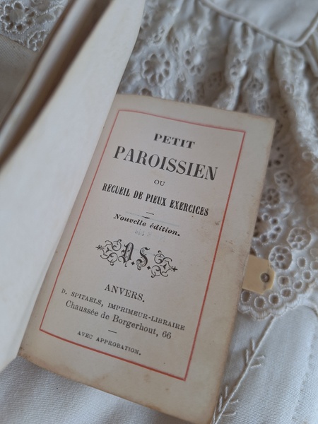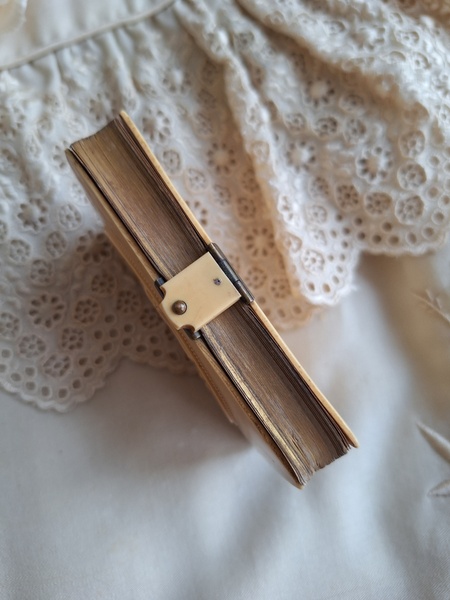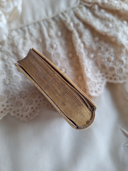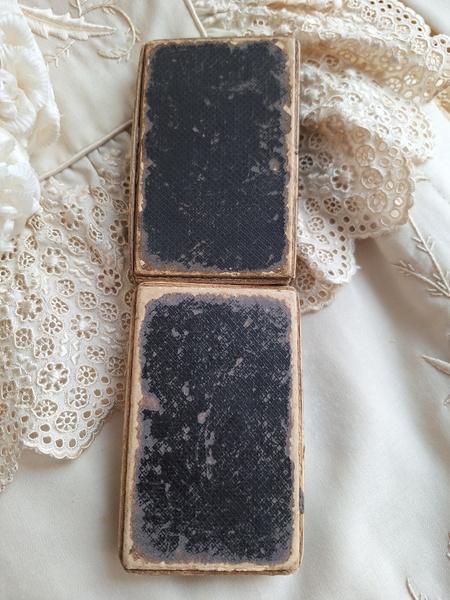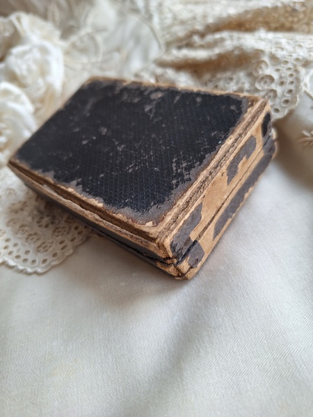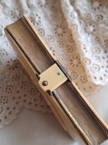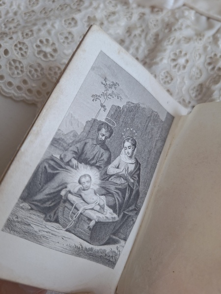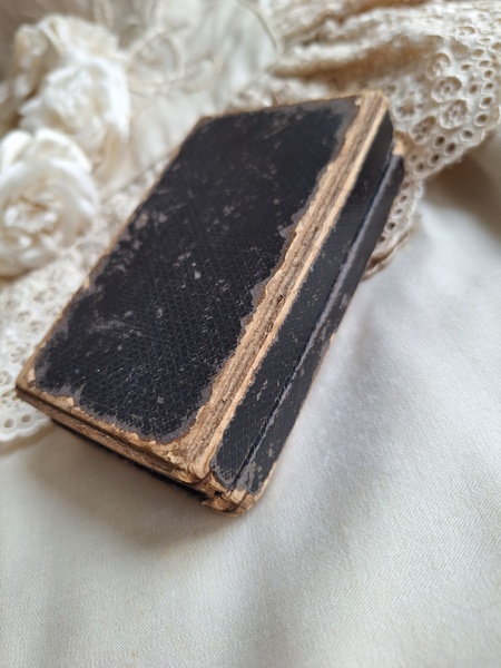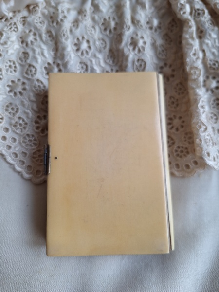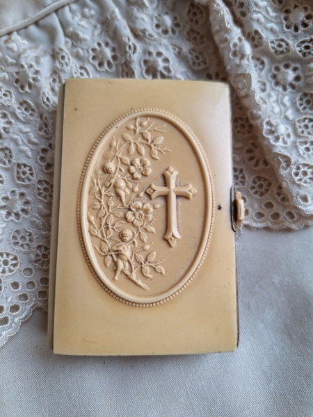 アンティーク天使のミサ典書です。フランス語で記載されています。ラズベリーの花かと思いますが枝の間にちょこんといる2人の天使が可愛いです。セルロイド製で状態は良いです。痛みはありますが珍しいカードボード製のケース付きです。ケースが残っているのは少ないですよ。ベルギーフランス語圏
