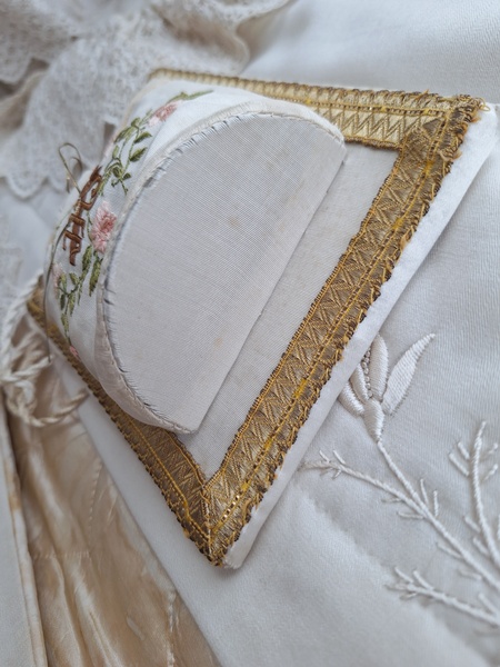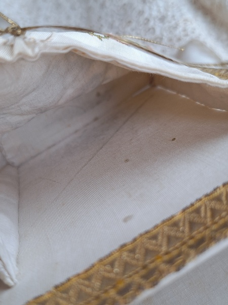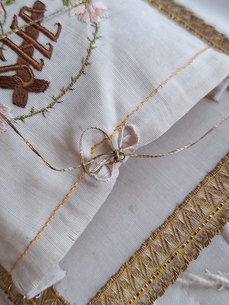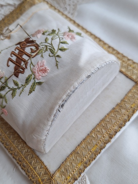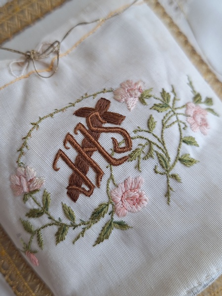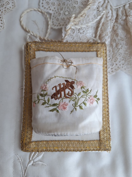 刺繍のミサ典書ポーチです。とても珍しいミサ典書用のケース/ポーチです。南フランスのアンティークショップで見つけました。ピンクの小さな花の刺繍が入っています。若干最後のような痛みがあるのですが愛らしいお品です。コレクションのミサ典書用にいかがですか?フランス製