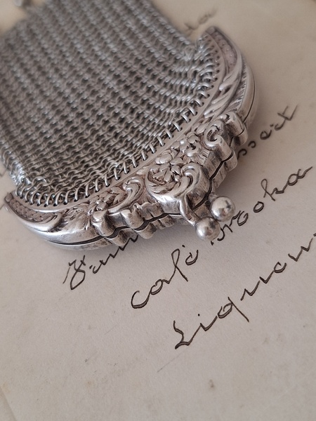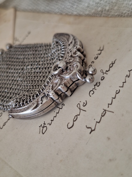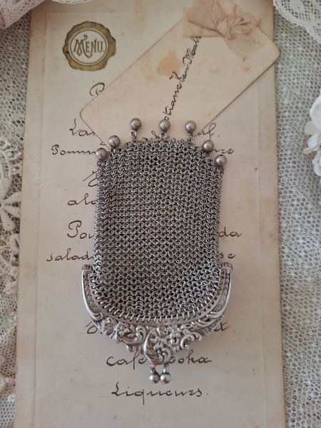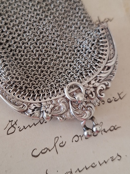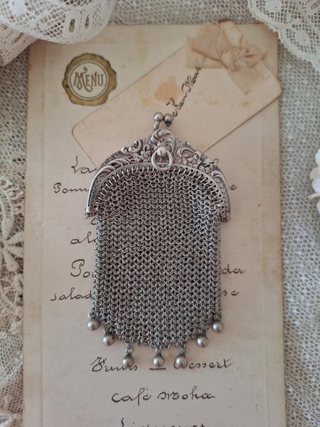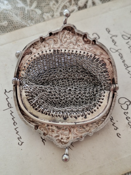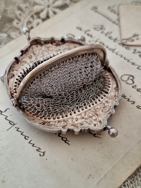 アンティークパースです。刻印があるのですが読み取れません。買い付けした時、変色していましたが手入れですぐに綺麗になりましたので恐らくシルバーで間違いないと思います。小さな花柄のレリーフが可憐で可愛いです。フランス製