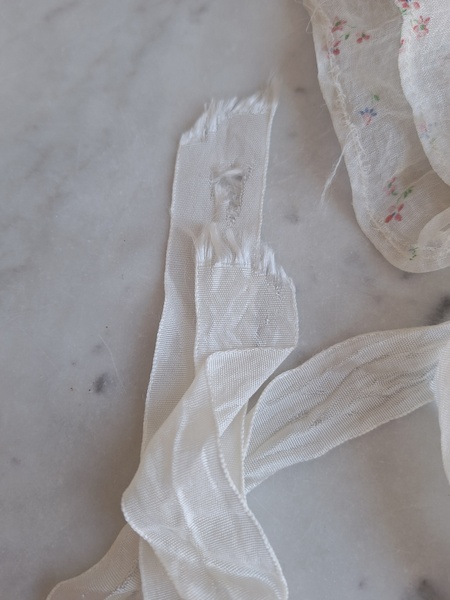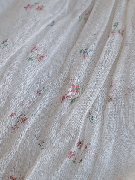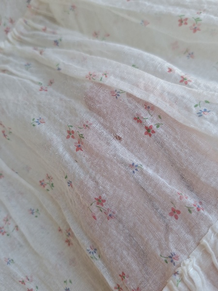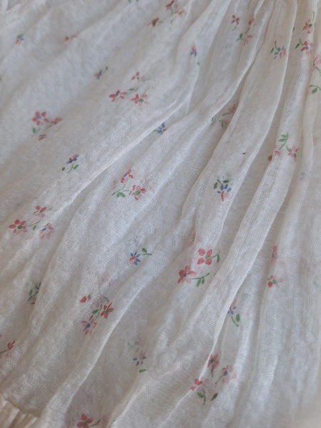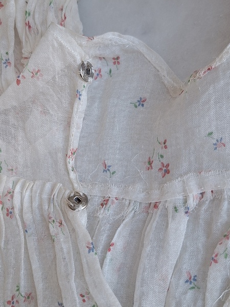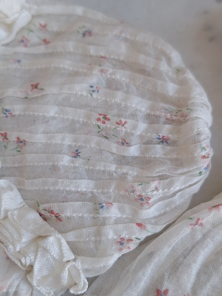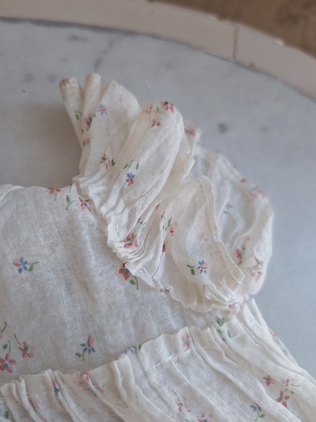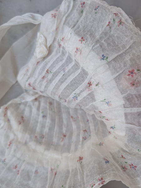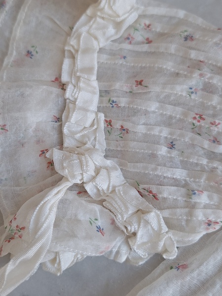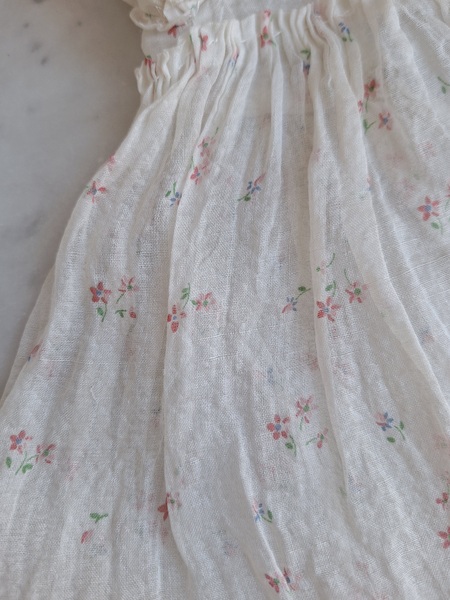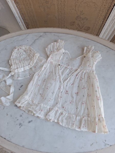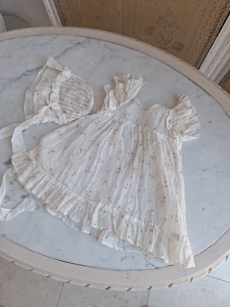 ドールドレス&ボネです。小さな花柄の生地にフリル感のあるガーリーなデザイン、リボン使いが可愛いボネ付きです。ドレスの中央に最後のような小さなホールが二か所あります。拡大していますので実際はもう少し小さいです。肉眼ではほとんど分からないかと思います。フランス