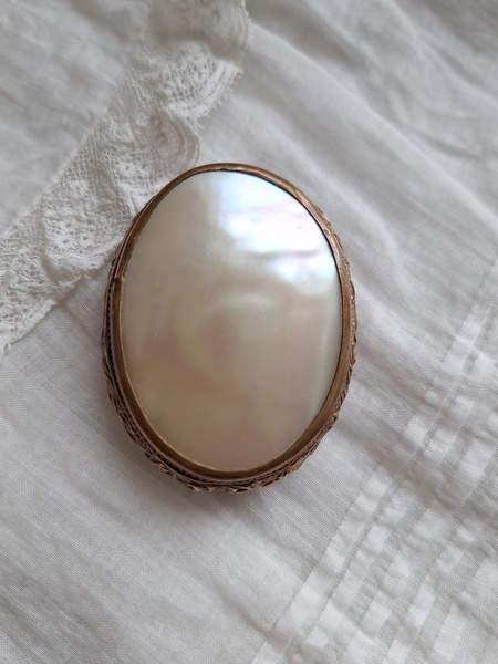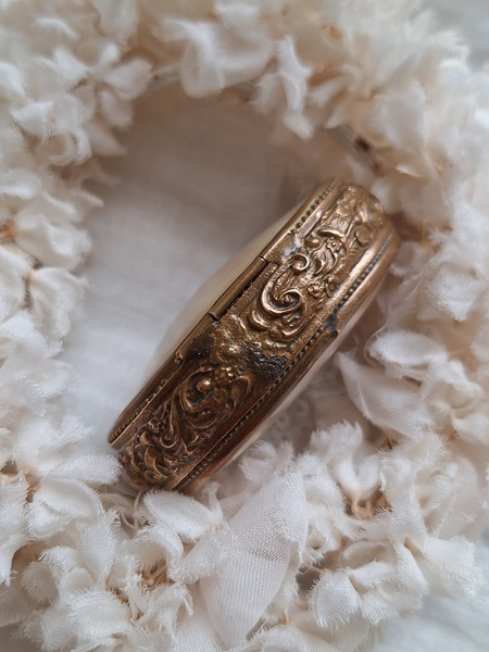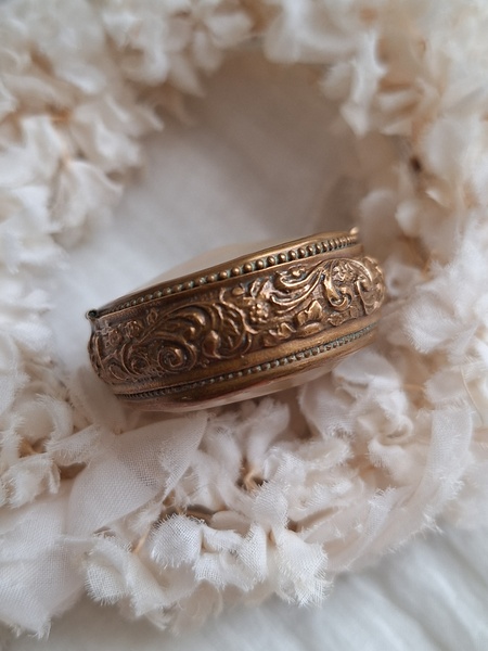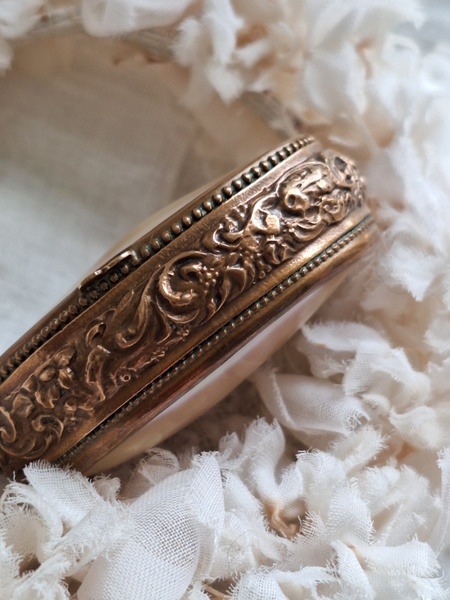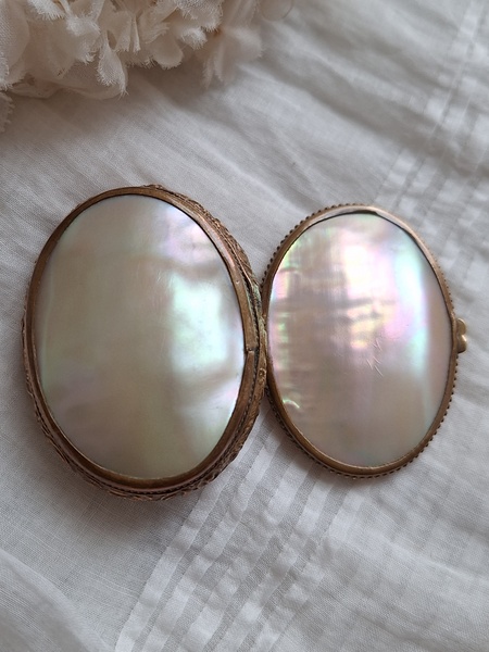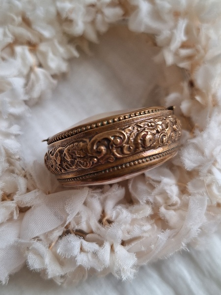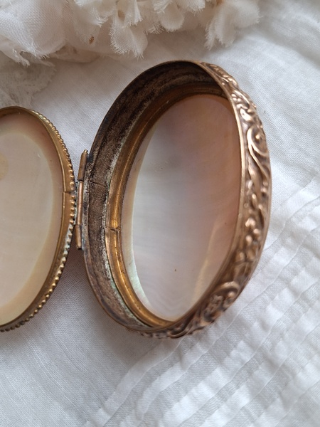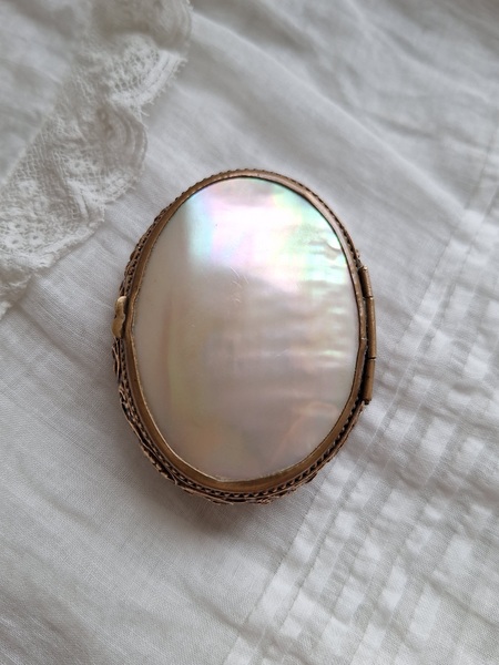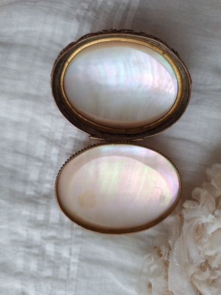 マザーオブパールケースです。何とも言えないパール色、側面のレリーフとの組み合わせが美しいケースです。恐らくロザリオが入っていたケースと思います。マザーオブパールのケースだと2パーツで作られている物が多いのですがこちらは一目惚れしました。とても良い状態です。フランス