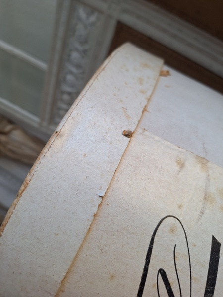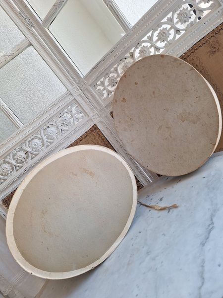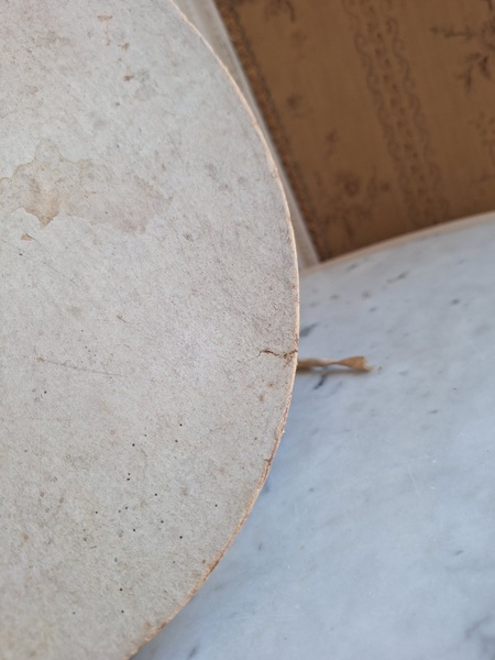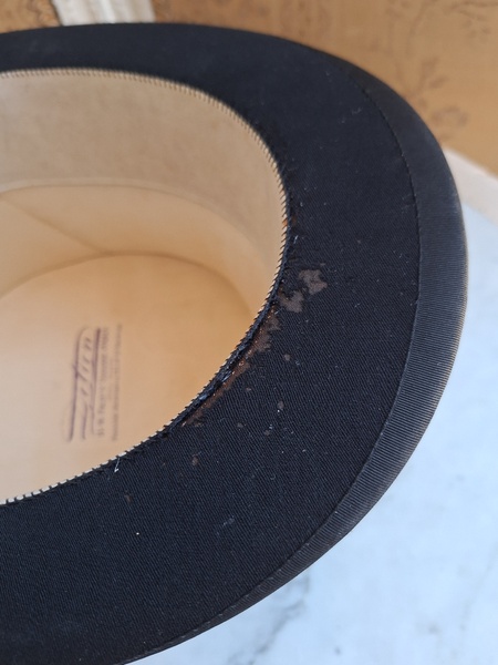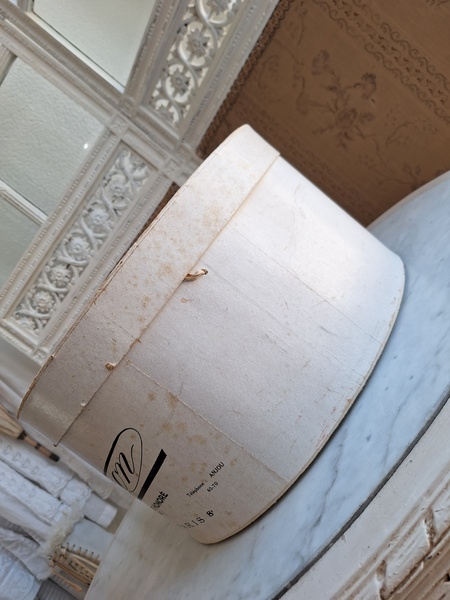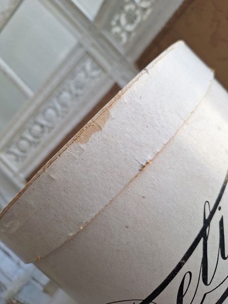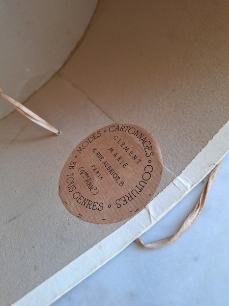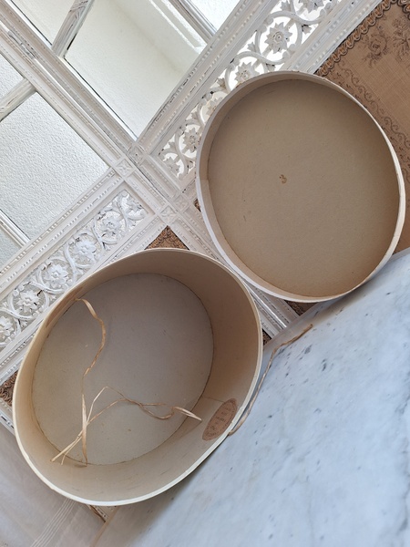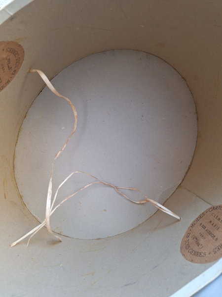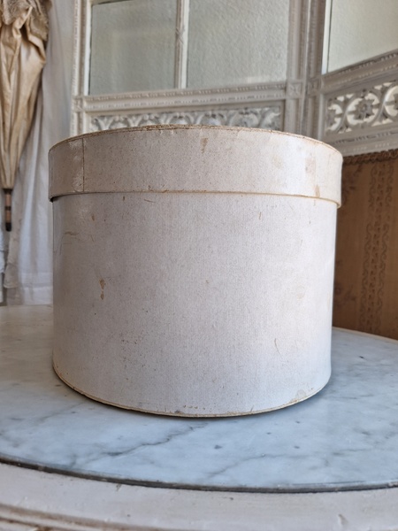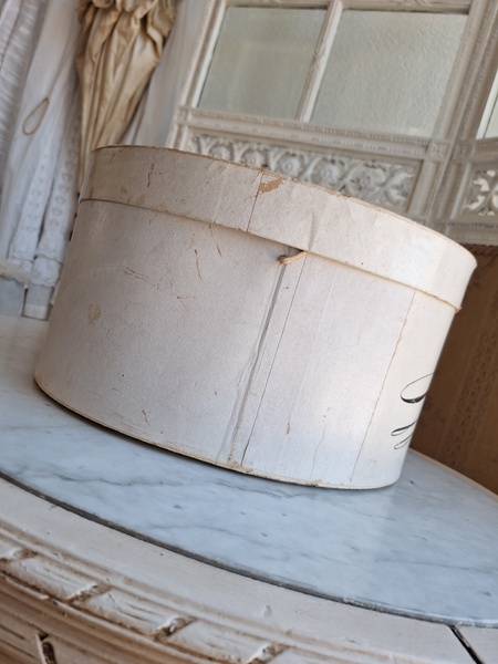 アンティークハットボックスです。人気のホワイトボックスです。薄い色褪せ、蓋に小さな痛みはありますが全体的に良い状態と思います。内側に後で付けられたラベルが2箇所あります。紐等はオリジナルのままですので何故付けられているか不明です。ハットも付いていますが最後の画像のような痛みがあります。ハット付きのお値段ですのでお買い得ですが、送料がかかりますのでハット無しの場合は下記の送料ランクでお送り出来ます。フランス製