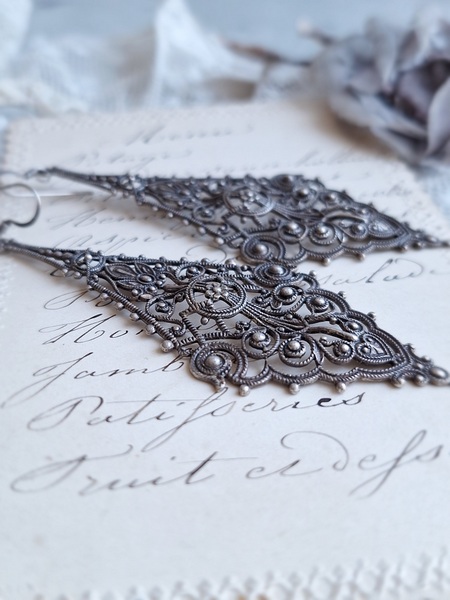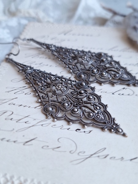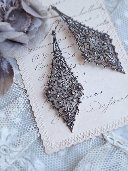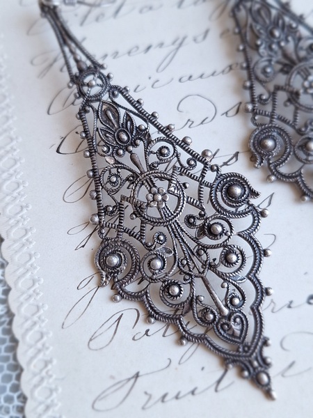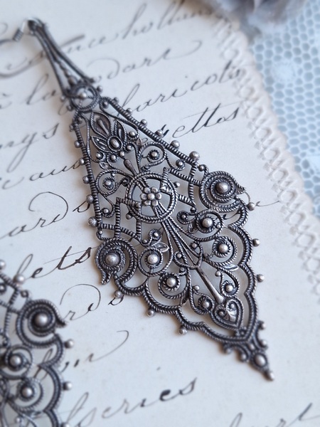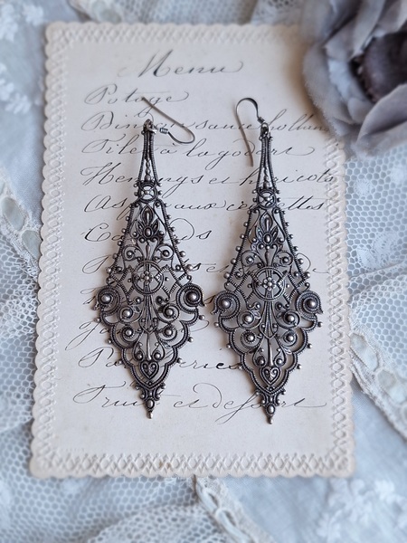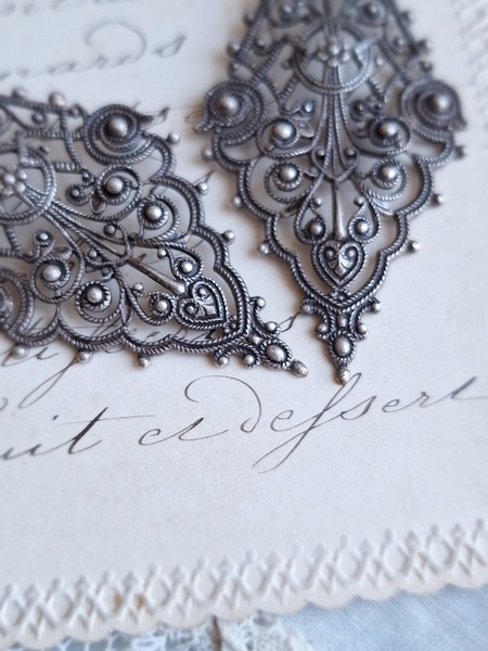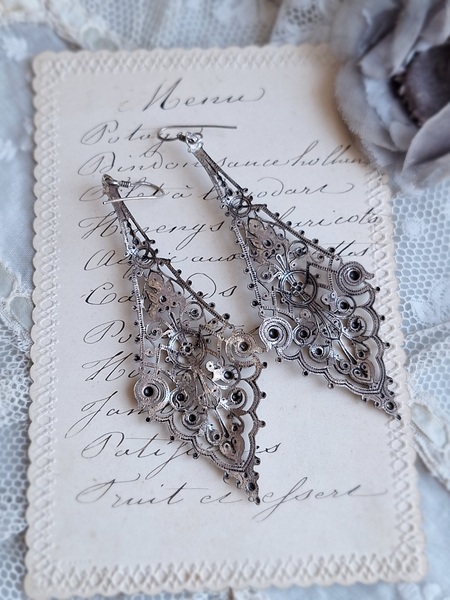 フィリグリーピアスです。刻印は見当たらないのでがベルギーのジュエリーを扱うディーラーさんよりシルバーとお聞きしています。アートデコの透かしのデザインが美しいです。実際に手に取っていただくと品実も感じていただけるお品です。ベルギー