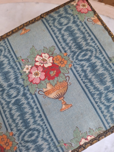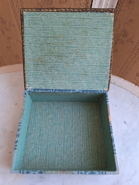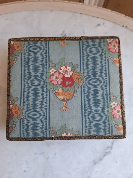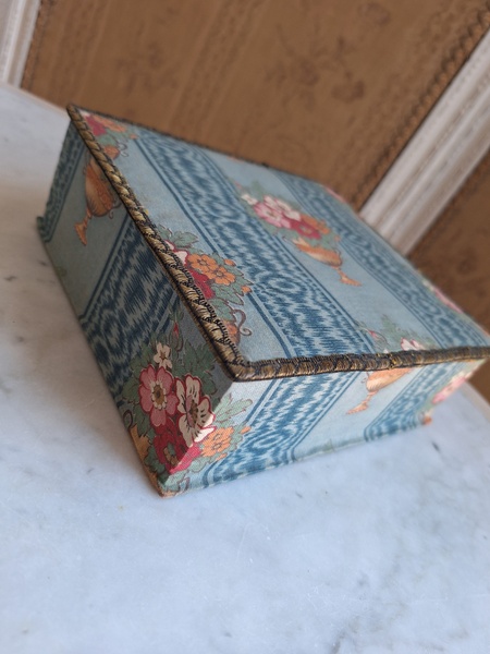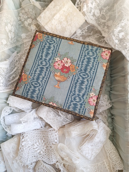 カルトナージュボックス付レースです。フランスのカルトナージュボックス付です。レースは大体良い状態ですがクロスは痛みや汚れがあります。ただ縁に使っているレースは比較的取れますのでハンドメイドに活かしてください。フランス製