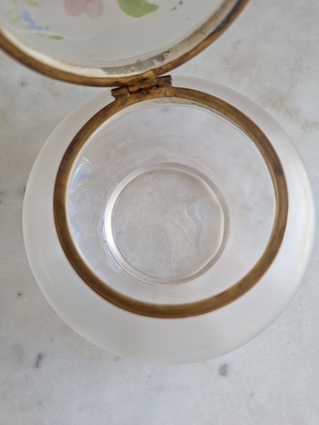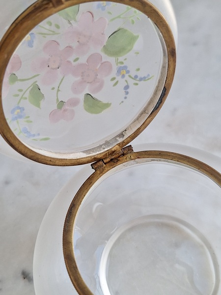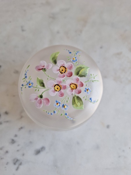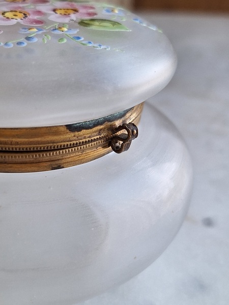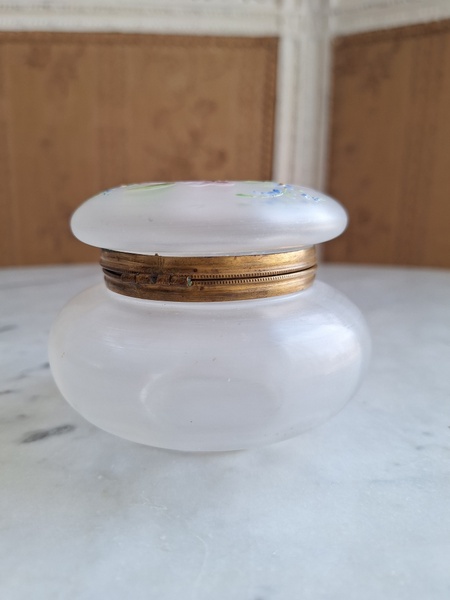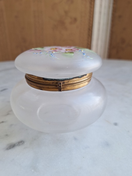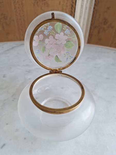 アンティークガラスパウダージャーです。ピンクの小さな花と勿忘草がエナメルで描かれています。白粉、パウダーを入れていたケースですがジュエリーを入れたりされても。フランス