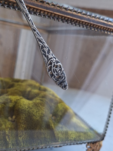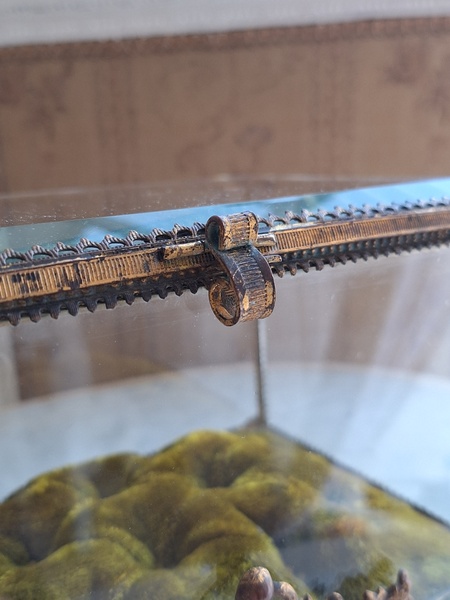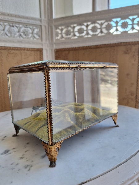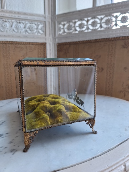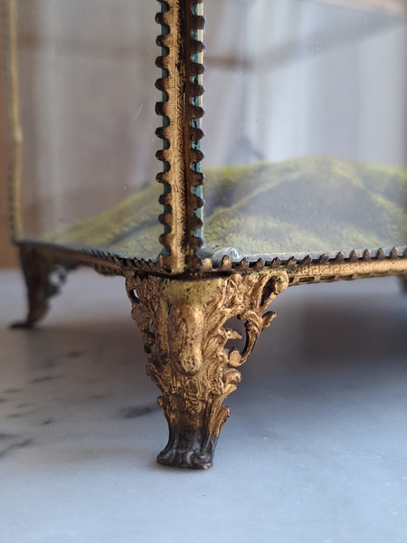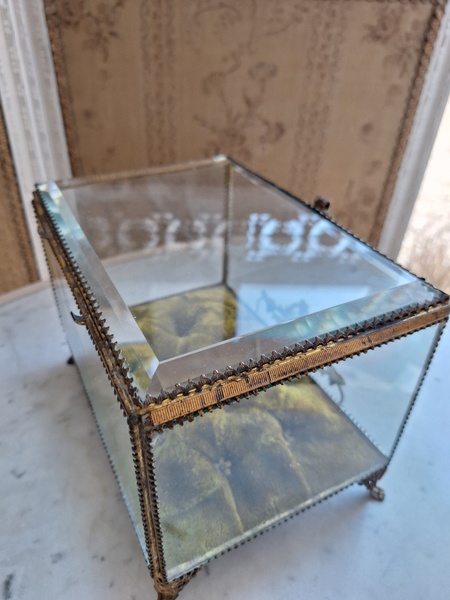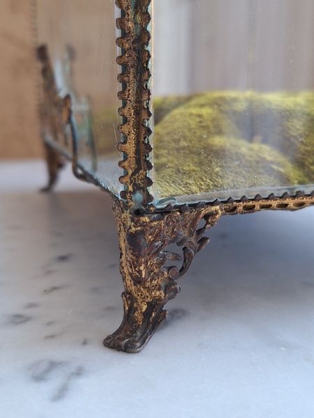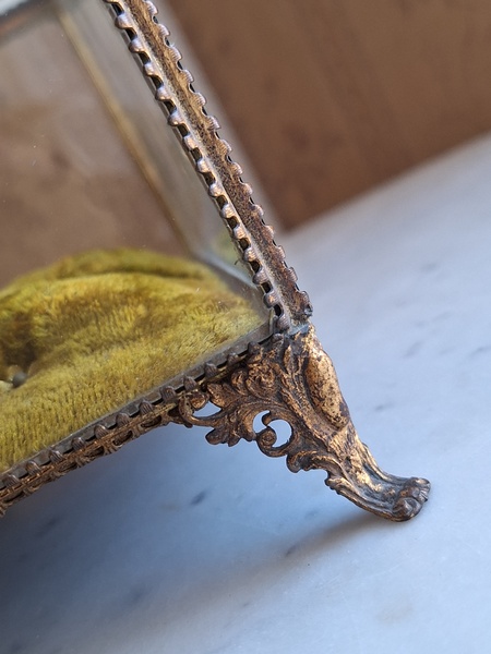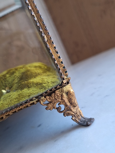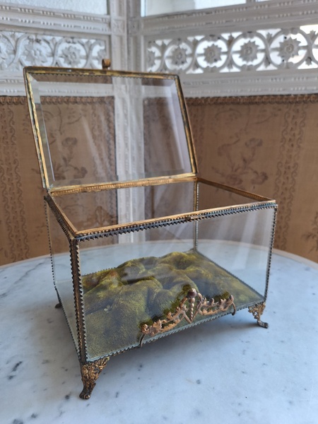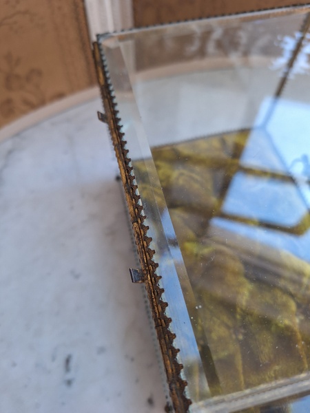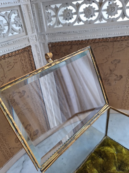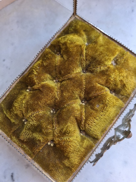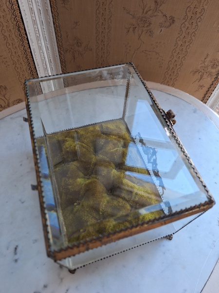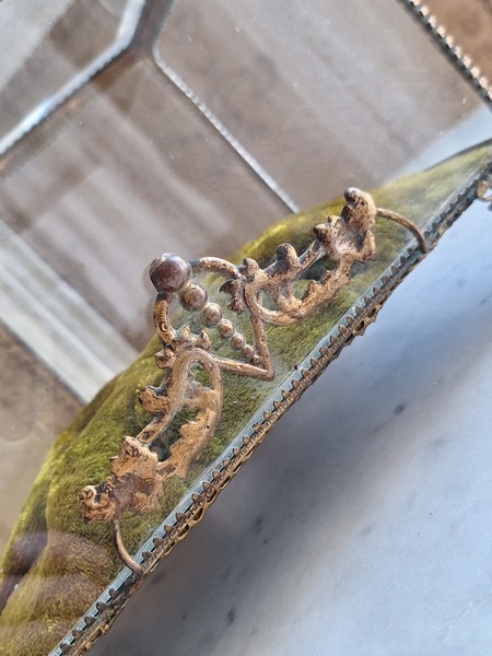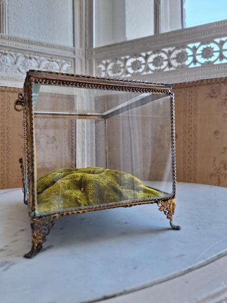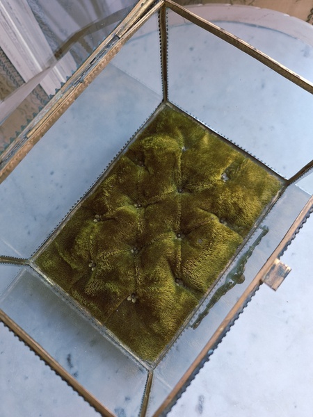 マリエクッション付ガラスケースです。マリエで使用したワックスティアラを記念に入れていたケースです。画像のワックスは含まれていません。(私物)しっかりした造りでずっしりと重みがあります。ガラスの角、フレーム内に隠れる程度のチップがありますが拡大画像でもほとんど見えないと思います。こちらのケースやジュエリーケースにも多いコンディションです。ガラスの傷は見られますが全体的に良い状態です。こちらのアイテムももう見かける機会が無くなりました。また見つけても今回買い付けした額の2.3倍でやり取りされています。お色が好みでしたらお勧めですよ。クッションは引いた画像の方が実際のお色に近いと思います。フランス製