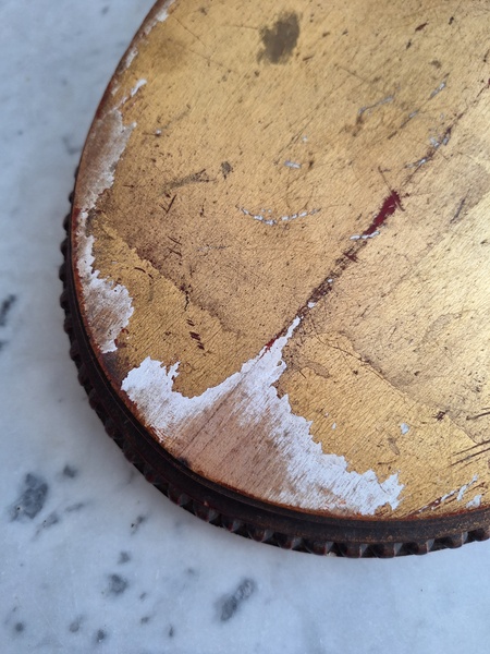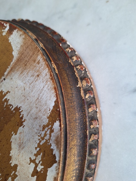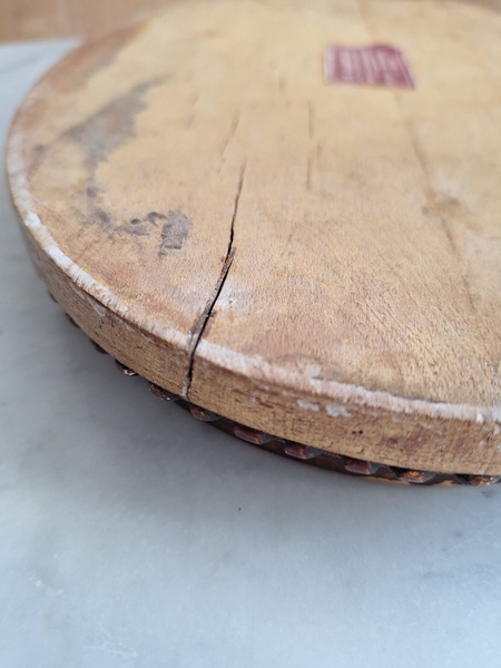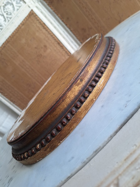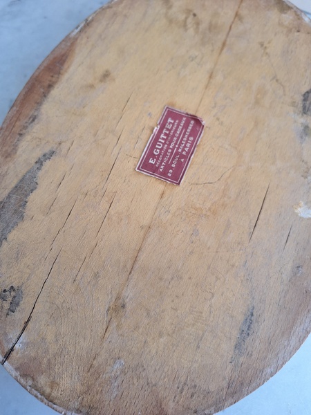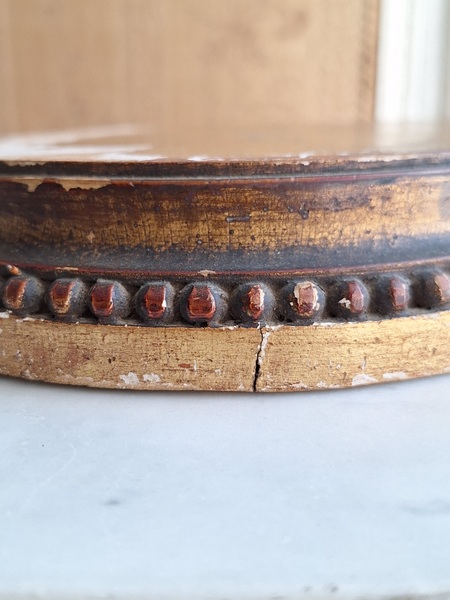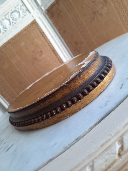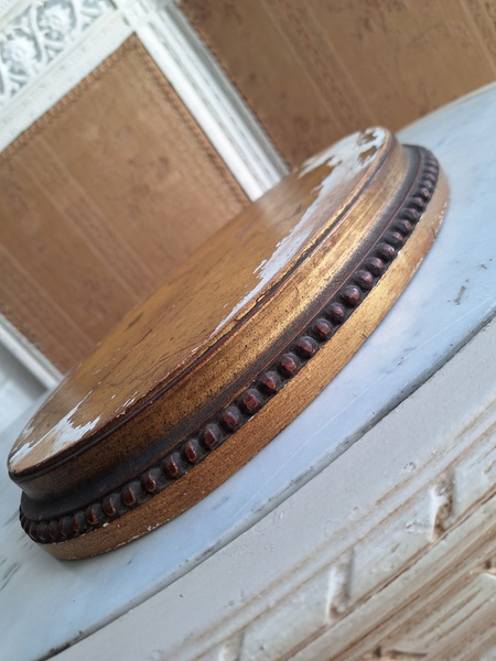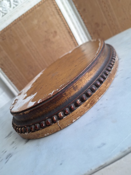 アンティーク台座です。天板はペイントが剥がれていてシャビ―ですが木製のずっしり重いしっかりした造りのディスプレイ台です。2枚の板が使われていて真ん中にヒビが入っているように見ています。裏は木が乾いてヒビが入っている箇所がありますが側面等は状態は良いです。フランス