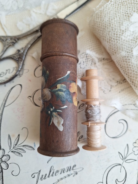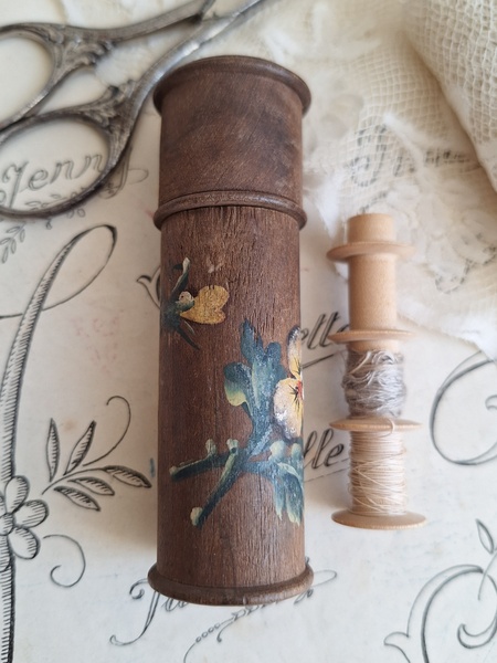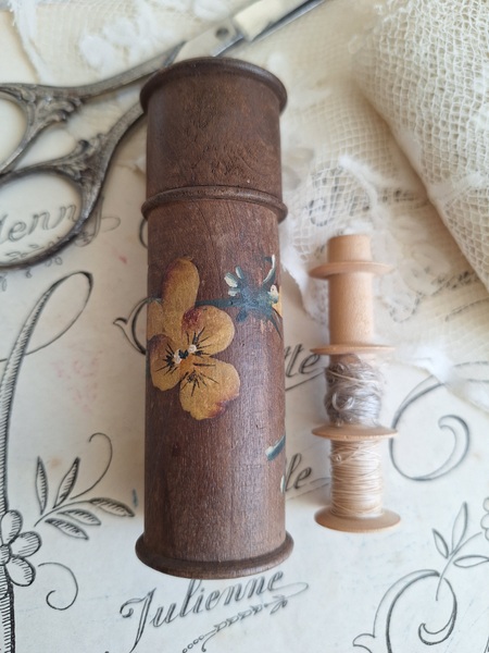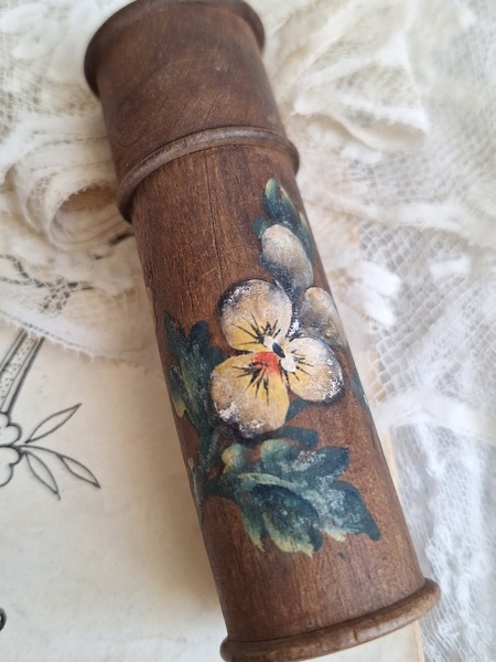 パンジー柄ボビンケースです。ベルギーSPAの工芸品です。柄は手で描かれています。ニードルケースは時々見かけるのですがこのようにもともとはボビンが入っていたケースだったのかもしれませんね。こちらはフランスで見つけました。素朴な木製の温かみあるケースに淡い色合いの手描きのパンジーが可愛いです。ベルギー製