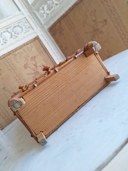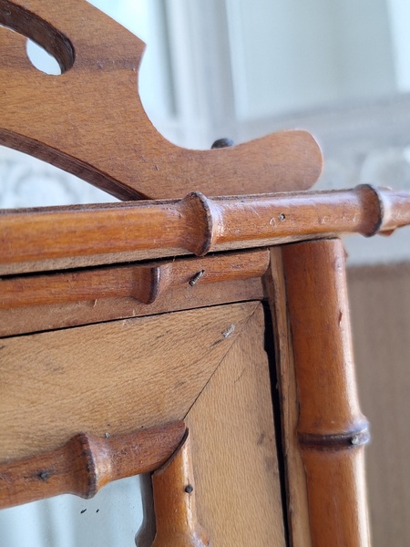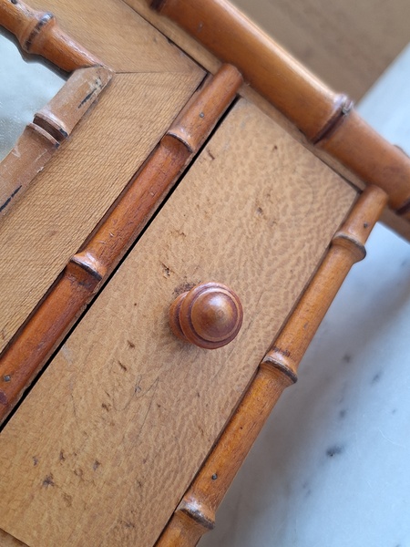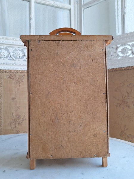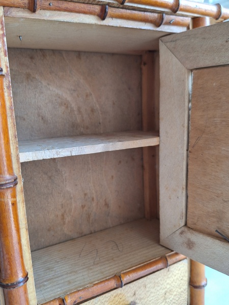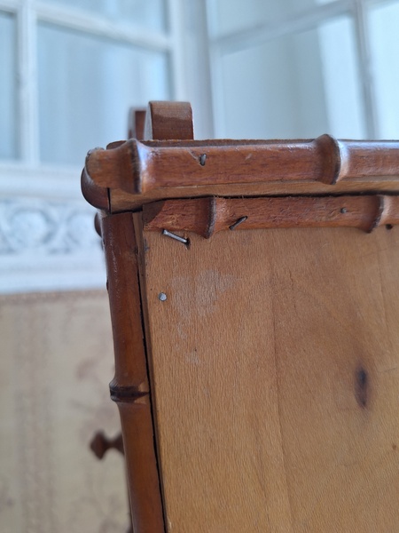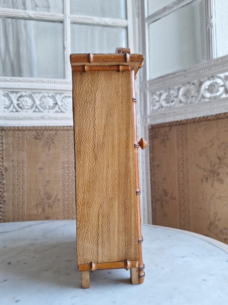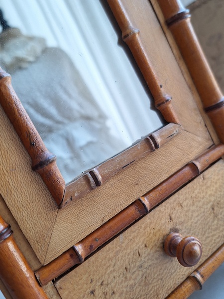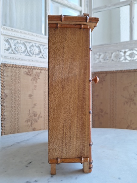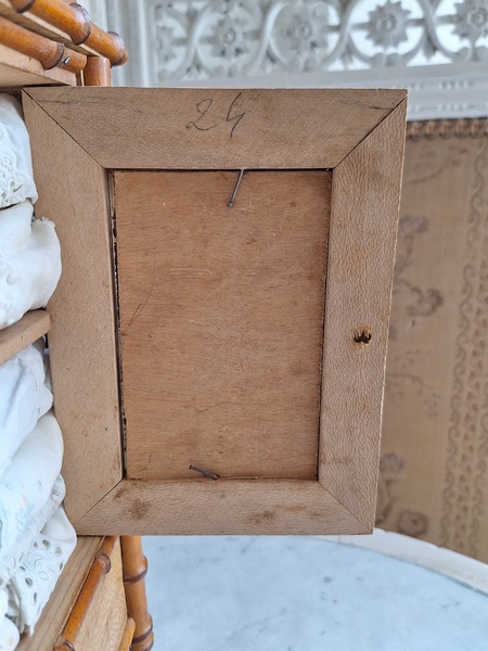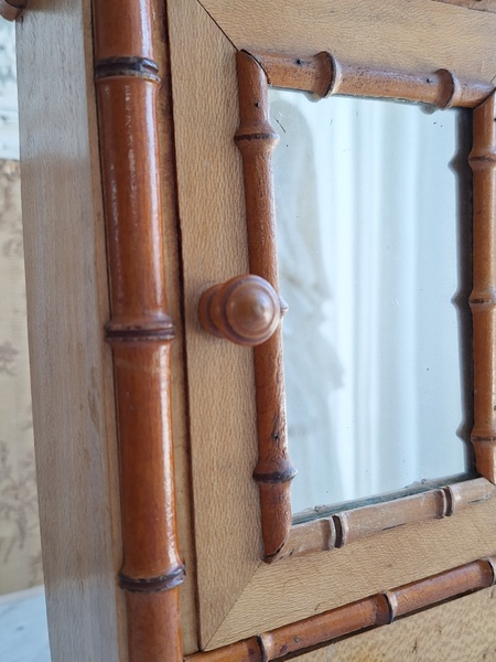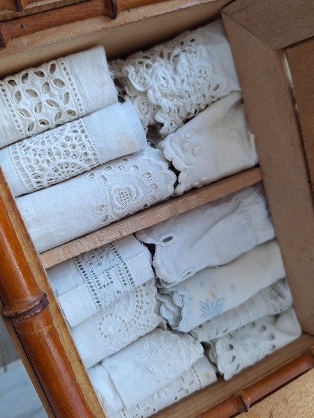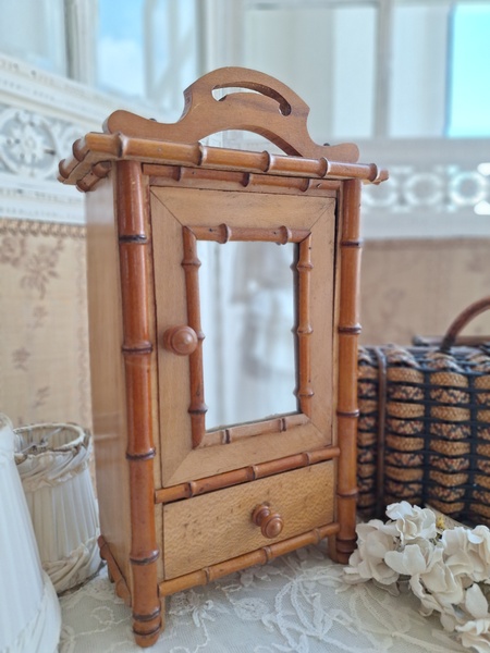 レース付ドールキャビネットです。バンブータイプのドールキャビネット/クローゼットの中にレースがぎっしり詰まっています。ヨーロッパのお宅でも以前はこのようなキャビネットに寝具などのリネンを収納していました。そのようなイメージですね。ミラーの状態は良いです。側面の右上に小さなヒビがありますが他、全体的に良い状態と思います。フランス製