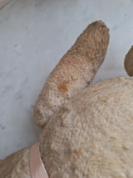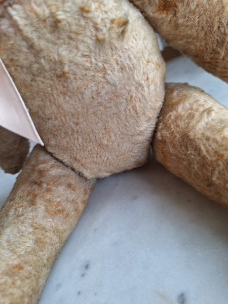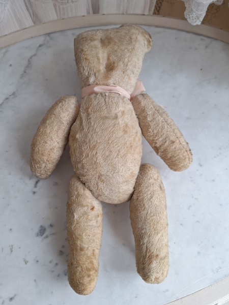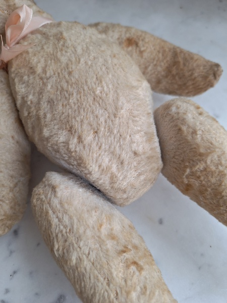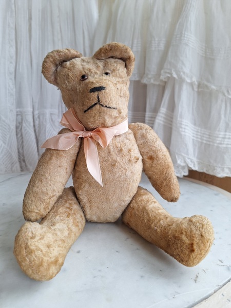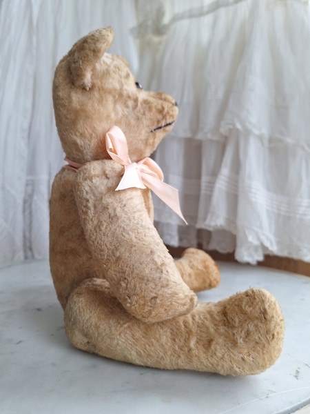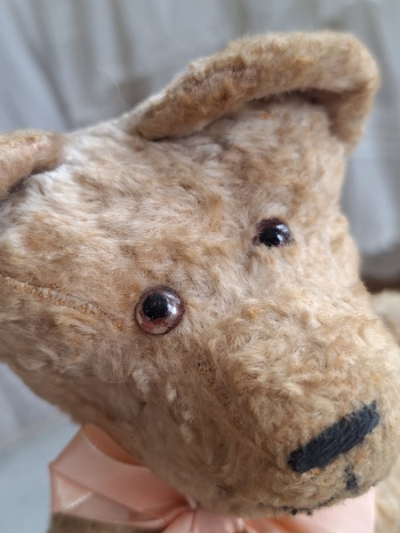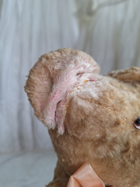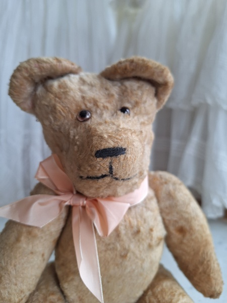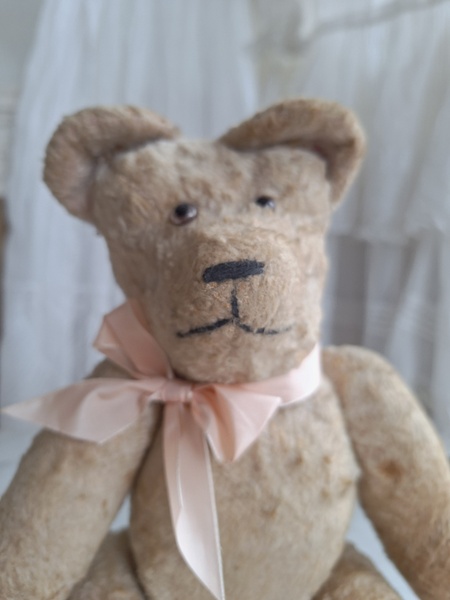 フレンチテディベアです。恐らくJPMのベアと思います。ちょっぴりおとぼけの小顔の可愛い子です。鼻の刺繍は後年刺し直されているようです。目はガラス製、中は藁です。手脚はジョイントで動きます。耳の辺りはピンクです。経年で色褪せしているのでベージュぽいお色に見えますが薄いピンクだったのかもしれません。フランス製