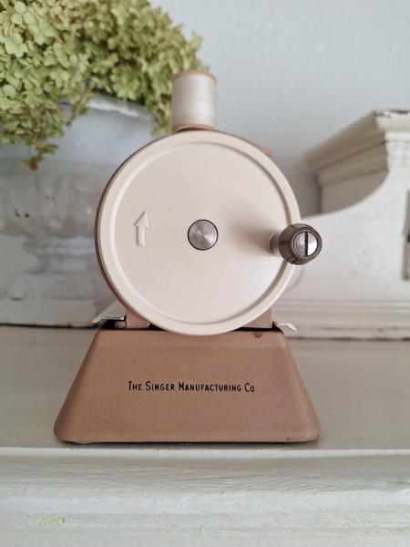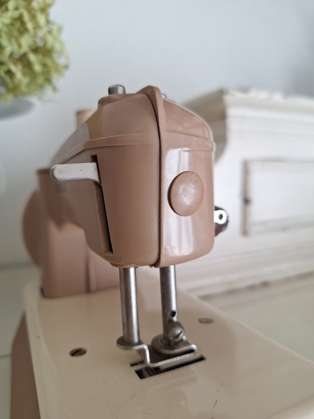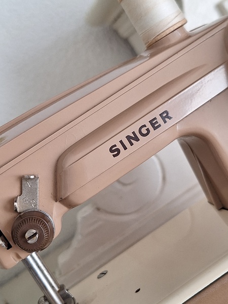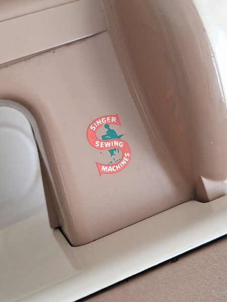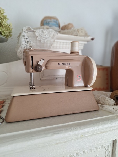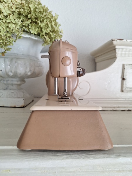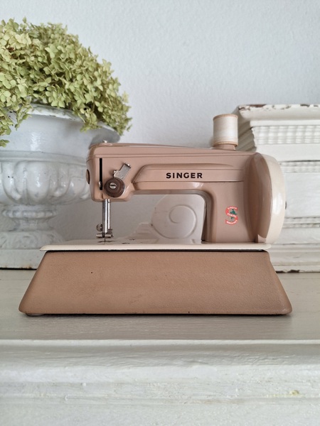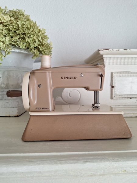 ヴィンテージシンガートイミシンです。ピンクベージュの可愛いトイミシンです。アイアン製でずっしりと重みがあります。針も残っていて回すとミシンの動きはします。シンガーのトイミシンはこちらではかなり高値でやり取りされています。今回もトランク付きで状態の良い物が見つかりました。現地で2万円くらいで販売されているかたが多いです。お探しの方はどうぞ。イギリス製/1960年代