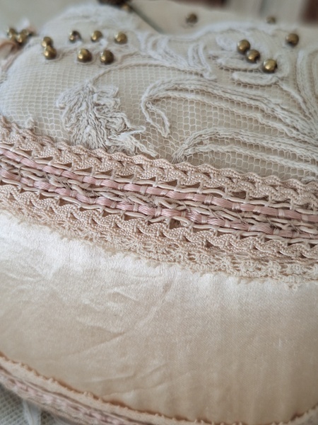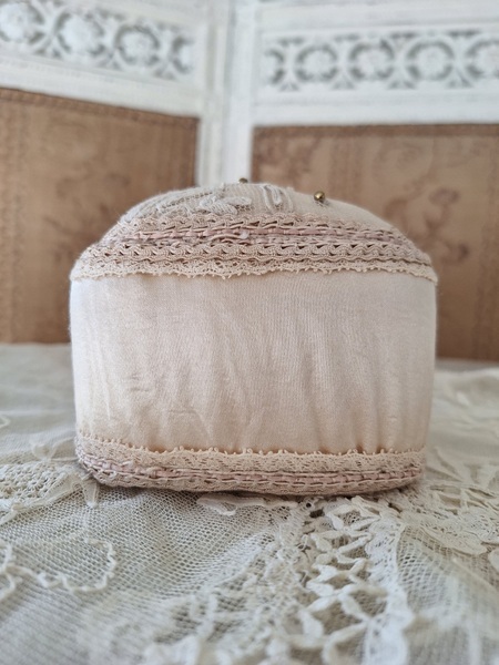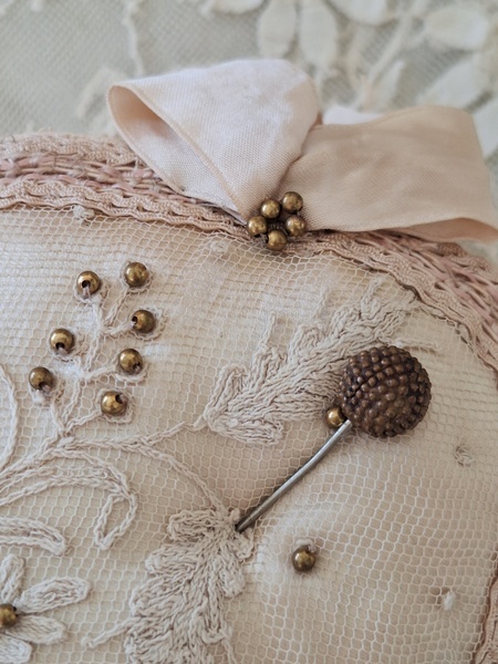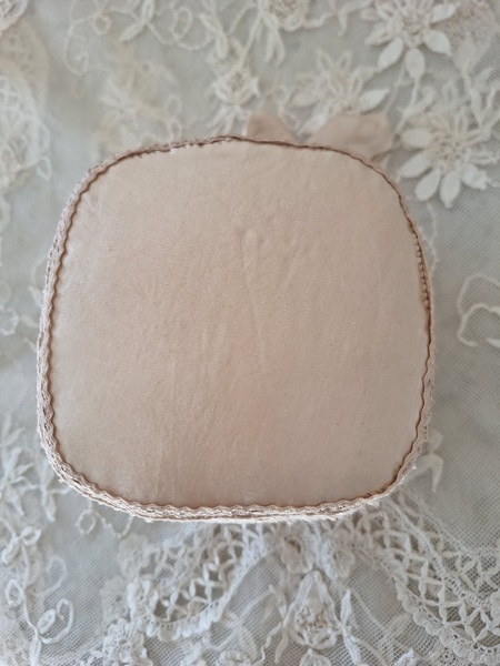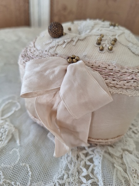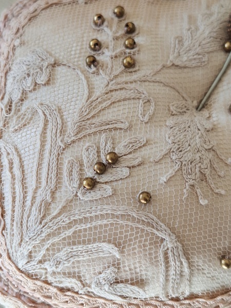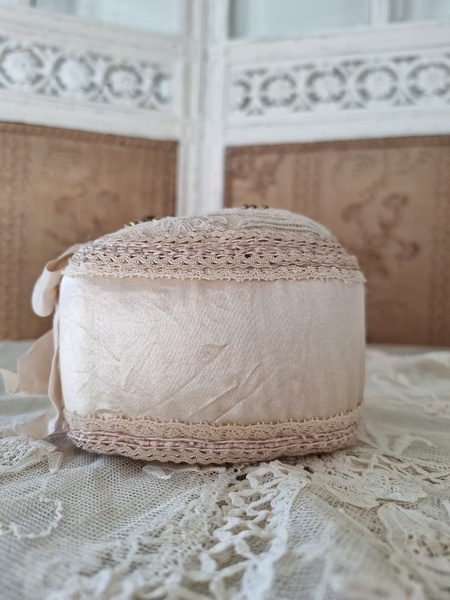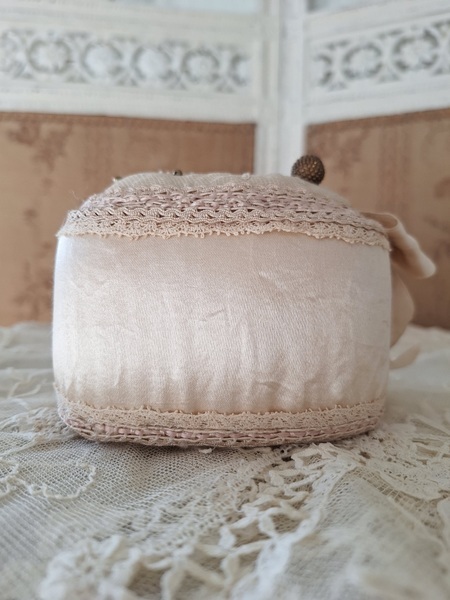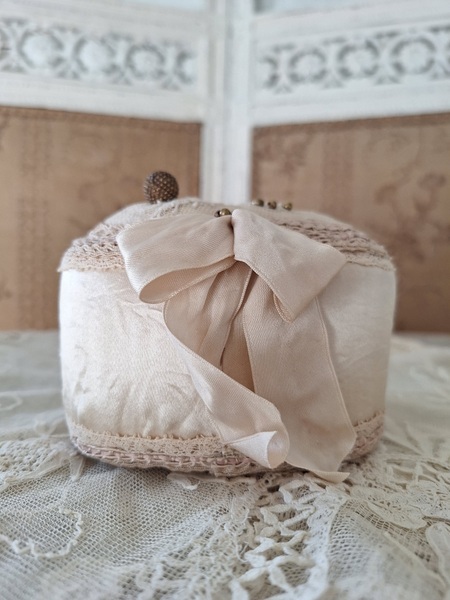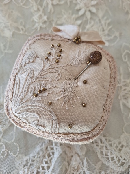 アンティークレースピンクッションです。シャンパンカラーの生地にレースが使われたクッションです。ヨーロッパのアンティークディーラーさんがアンティーク素材を使って作られた物です。彼女の作られたクッションやレースパ二エはこちらでも人気があります。レースの柄に合わせてヴィンテージのビーズで蕾を装飾されています。いつもながらディテイルもの素晴らしい彼女の作品です。フランスで時々お会いするディーラーさんでバケーションハウスで長期休暇されて現地でレースを買い付けしてクッションやバスケットを作られています。素材はフランスから