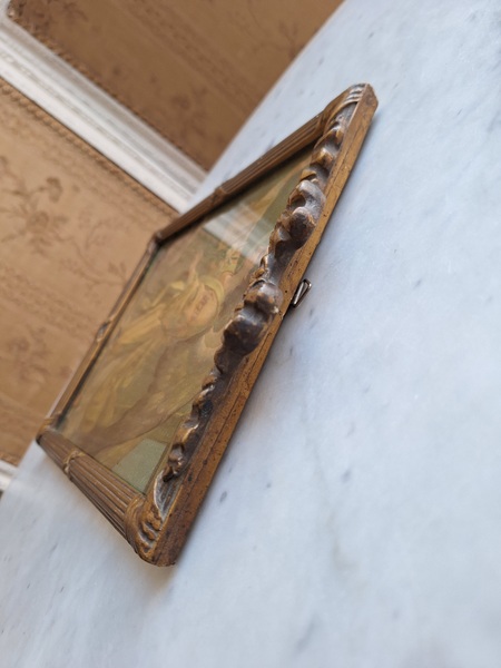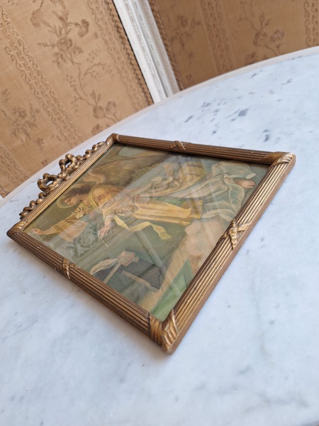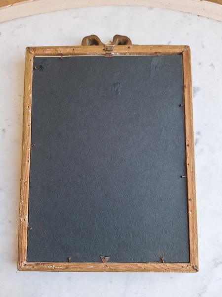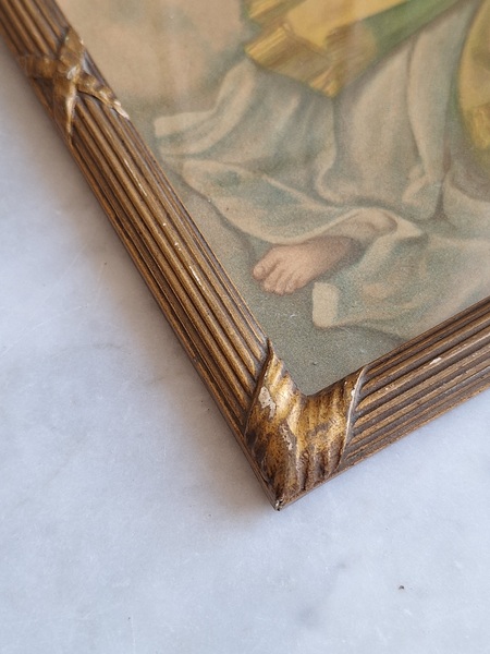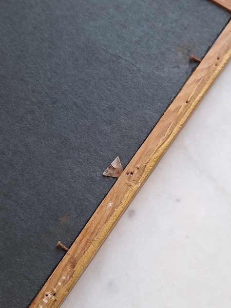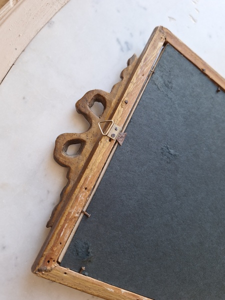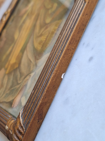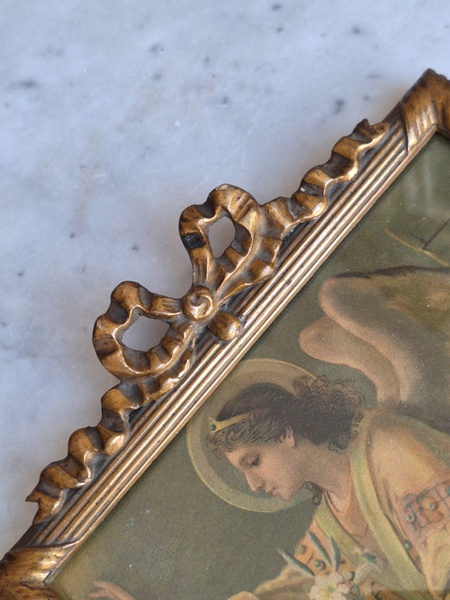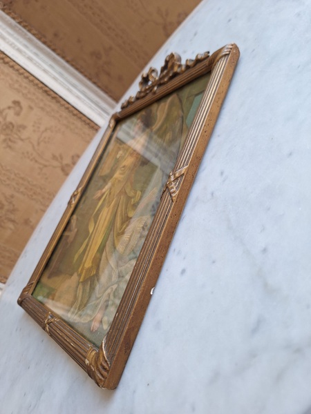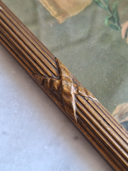 アンティークリボンの額です。素材は木製で表面は石膏です。真鍮のフォトスタンでもよく見られるモデルですね。側面にご覧のような薄い欠けがありますが全体的にとても良い状態です。こちらの素材の額はリボンの部分の石膏が折れたり、ヒビが入っていて良い物が出て来ません。額が気に入って買い付けしたのですがこちらのプリント画が好みでしたらお勧めです。プリント画は後年入れられています。お好きなプリント画や写真に交換したい方は後ろに貼られている紙を取っていただいくと表面のガラスを固定するために小さな釘が打たれていますのでそれをペンチで左右に少し動かしていただくと外しやすいですよ。あとは後ろに薄手の紙を貼られると埃も入らず、良いと思います。ベルギー