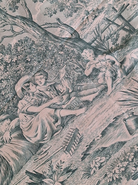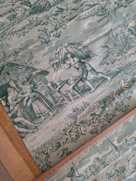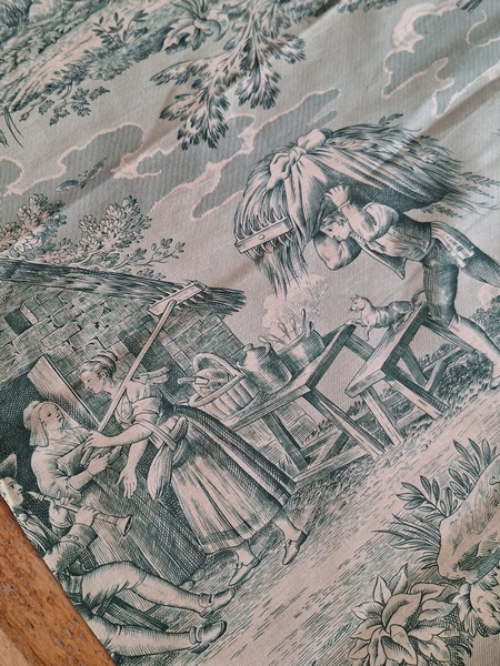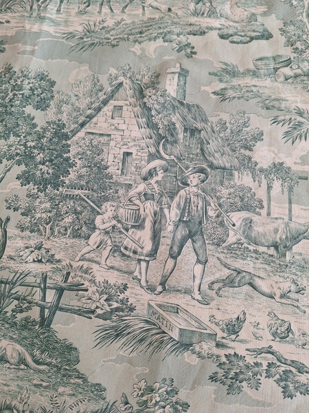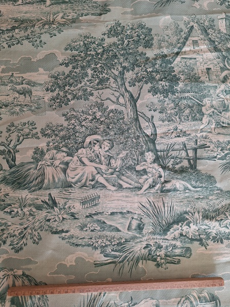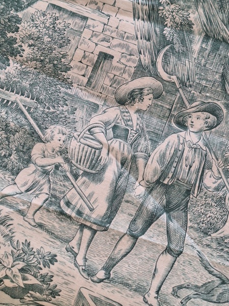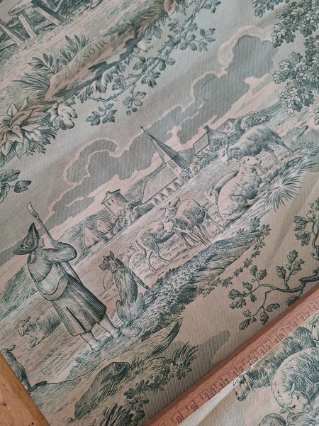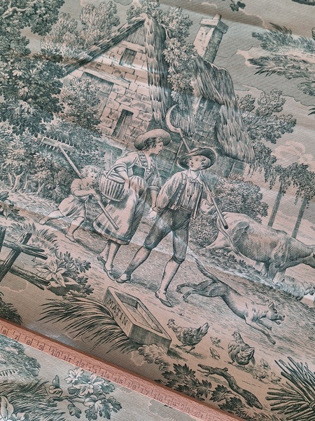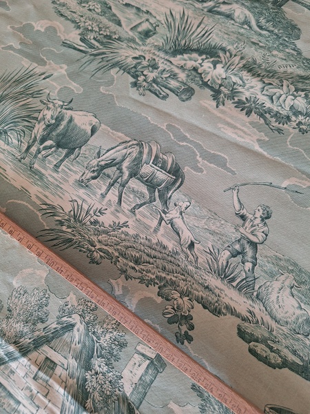 トワルドジュイ柄生地です。ヴィンテージのデッドストックの生地です。買い付け時にタグが付いていました。長さがありますので2枚重ねてカーテンなどにもしていただけますがクッションなど色々と活用出来ます。フランス