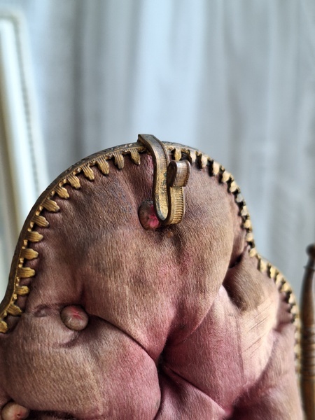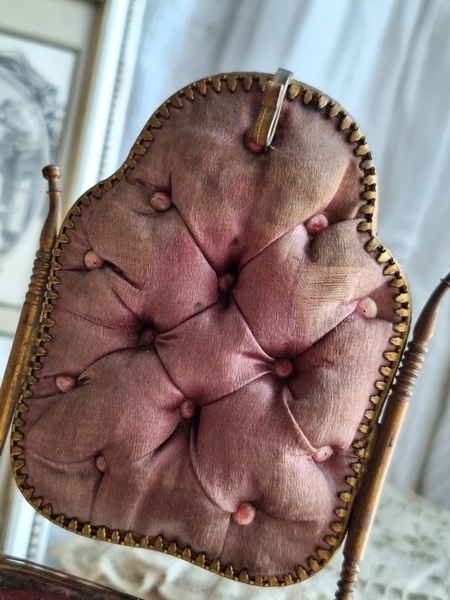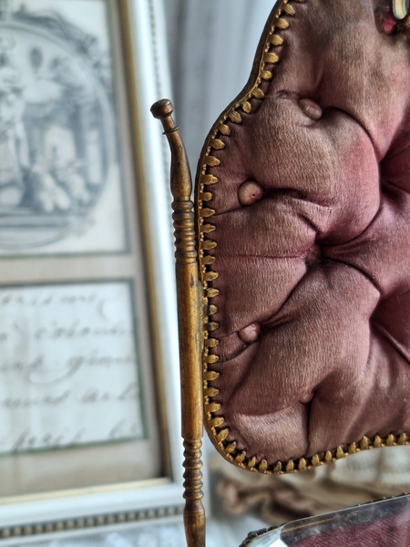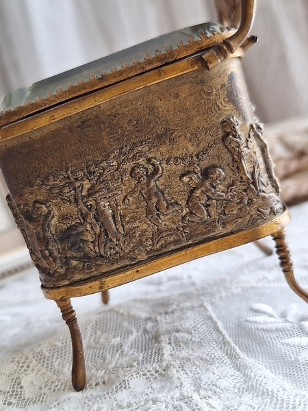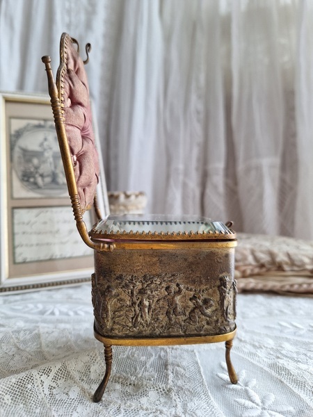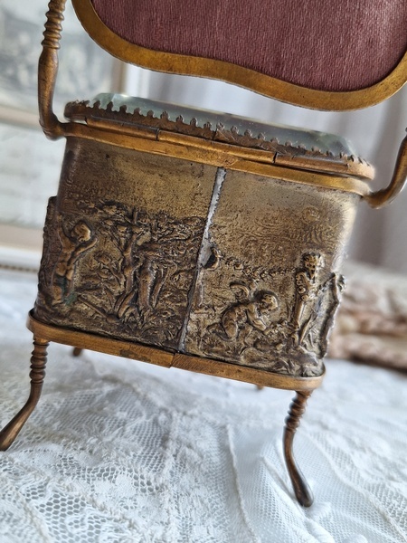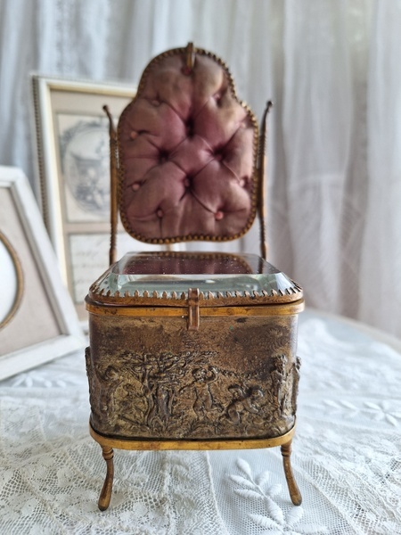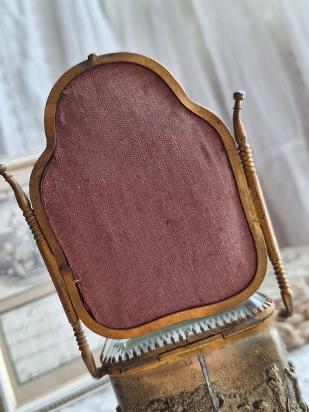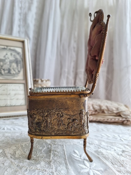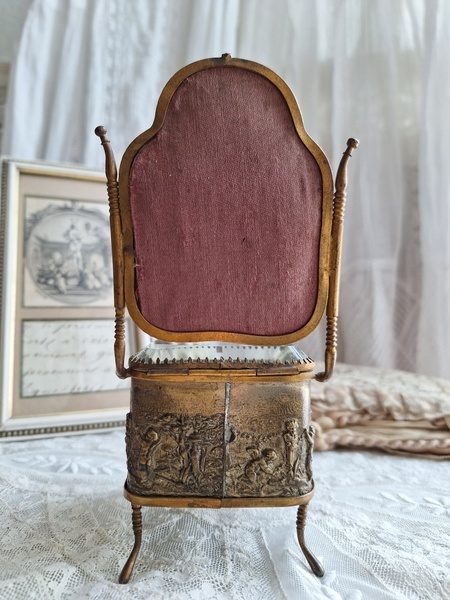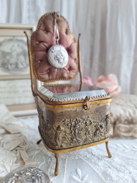 懐中時計スタンド付天使のジュエリーボックスです。こちらの天使のジュエリーケースだけはあるのですがクッション付きの懐中時計のスタンドが外側に付いた珍しいタイプです。クッションに若干痛みと色褪せ等がありますが古い雰囲気のあるお品です。中はご覧のように生地が乾いたのか側面の生地が短くなっています。クッションのボタンに痛みがありますが他、良い状態です。ケースのデザイン性の高さや外側のクッションの色褪せ感などに一目惚れしたお品です。この良さを理解してくださる方がいれば嬉しいです。フランス製