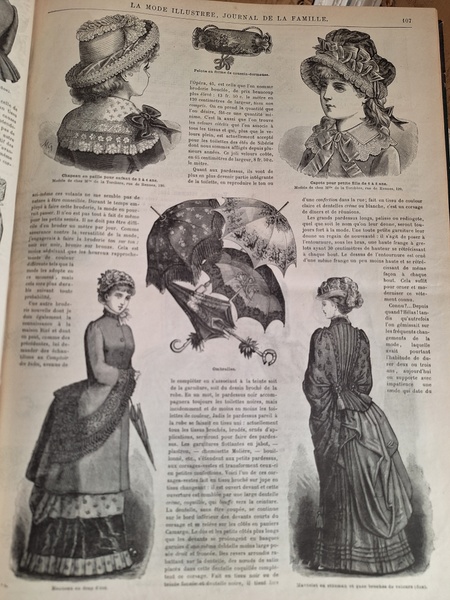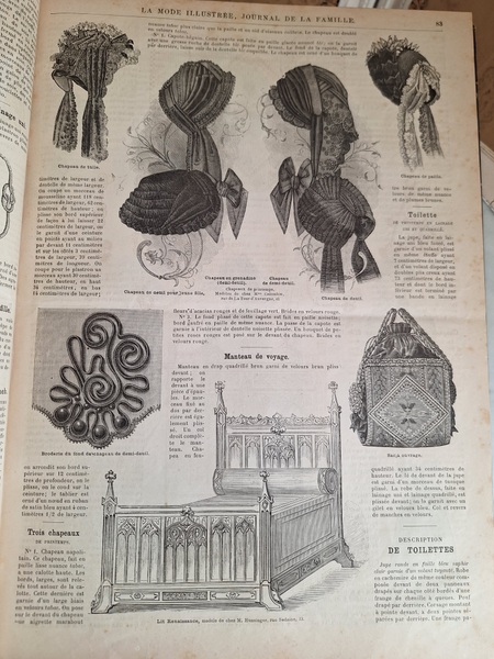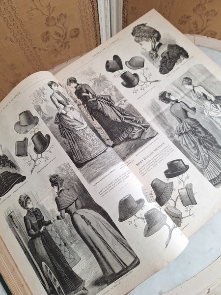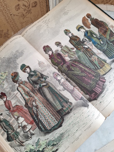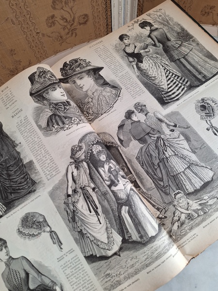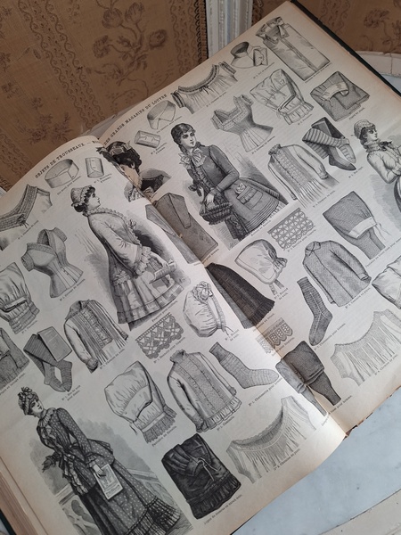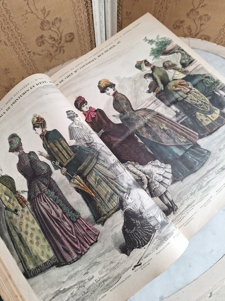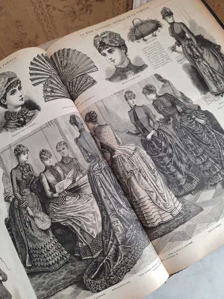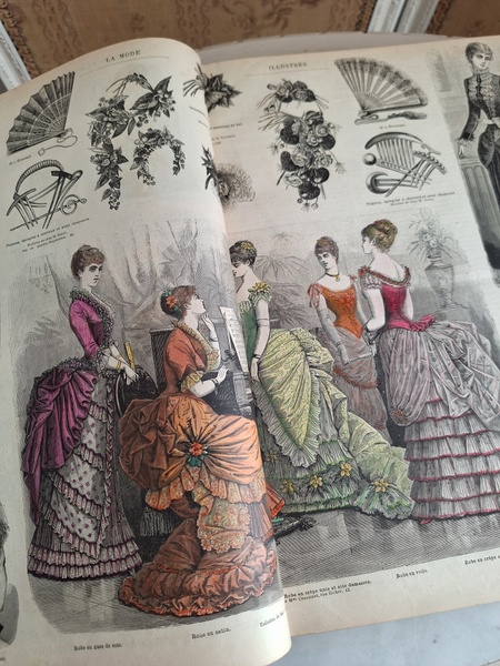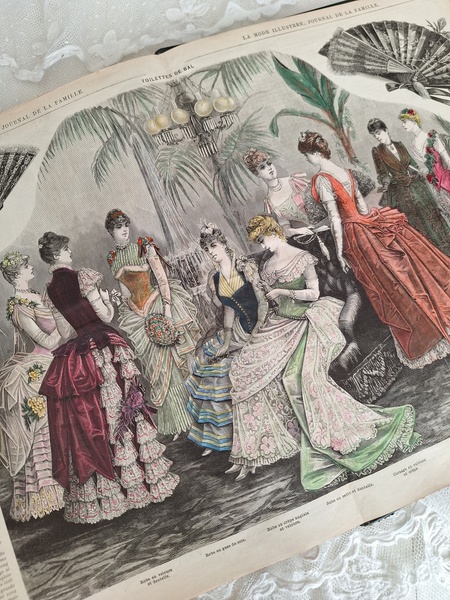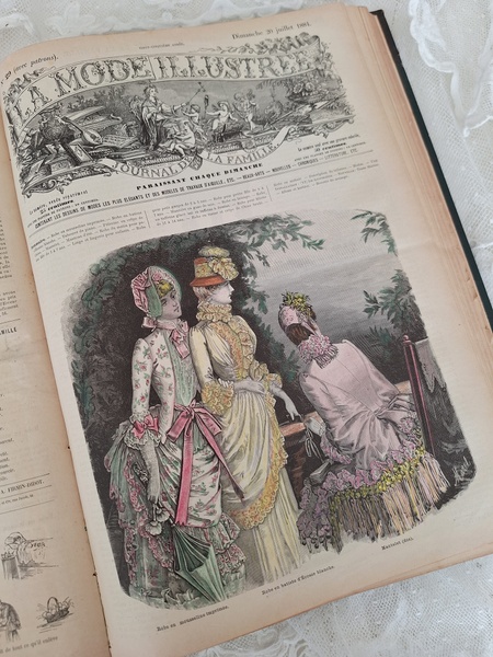La mode Ilustreeモード本La Mode Ilustree、ファッションモードのイラストレーションブックです。ヴィクトリアン期のファッションが楽しめる本です。ドレスはもちろんハットからアクセサリー、カーテン、当時の家具など子供から大人のファッション小物など幅広くイラスト付きで紹介されています。毎回ですが時間を忘れて見とれてしまう一冊です。全部見ていただけないのが残念ですが50枚程度、お写真付けさせていただきます!