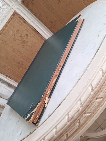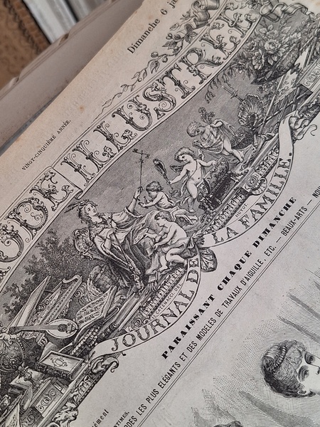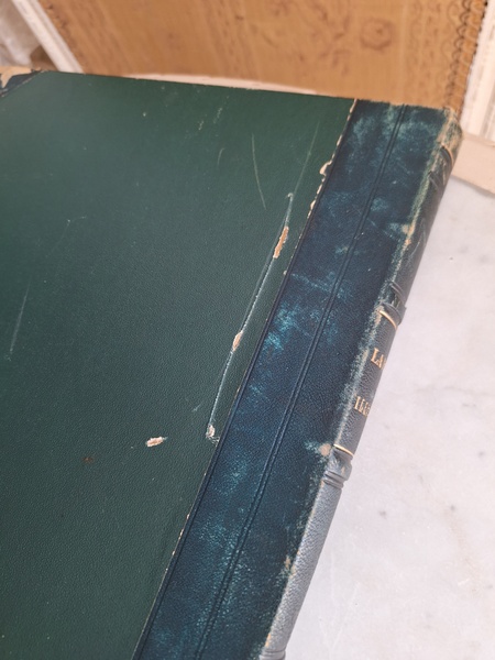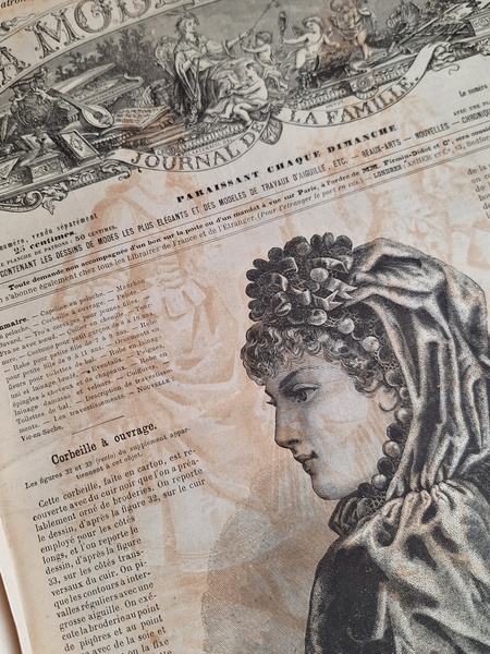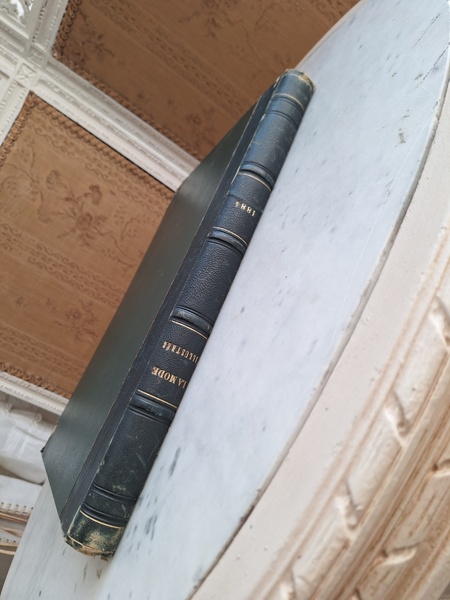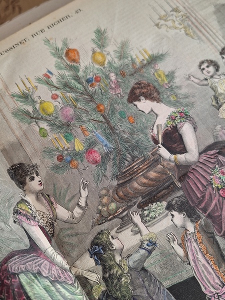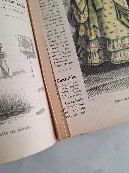 特にカラーページの細かい部分まで描かれたイラストは素晴らしいです。ページによってブラウンの柄のような物が入っています。ファッション画のようなのでオリジナルからこの状態なのか、何か挟んでいた物の色なのか不明です。ページ数はあっていて欠損はないようですが切れている部分は図案などがあったページと思われます。表紙はまずまず良い状態と思います。ページが破れたり、一か所取れかけている部分がありますが142年前の本です。年代と書籍と言い事を考えるととても良い状態と思います。大体、気になるページを全部添付しています。ご理解の上、ご注文ください。フランス製/1884年