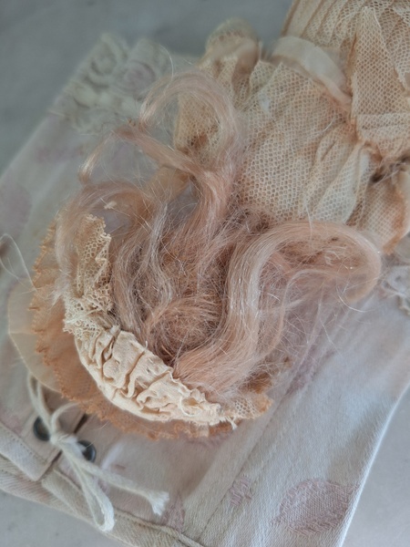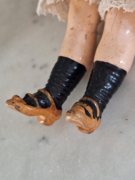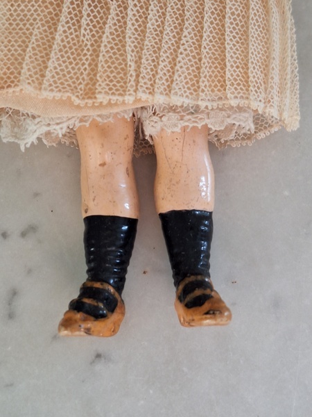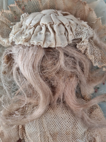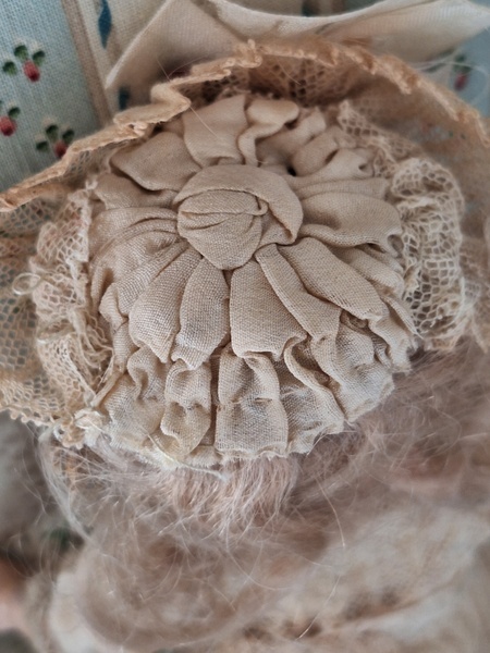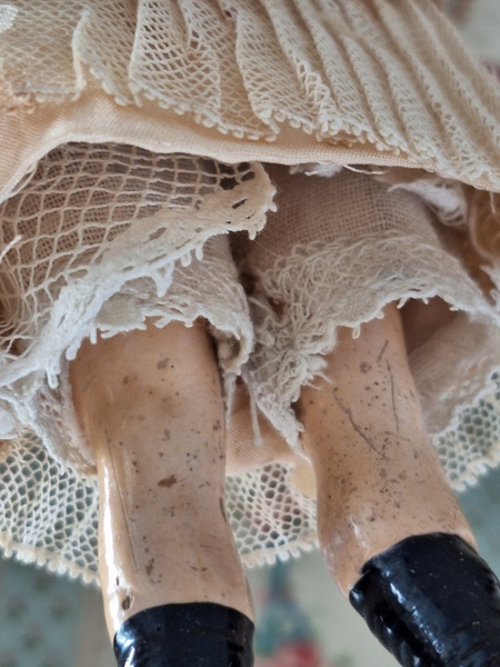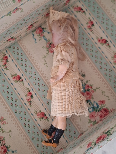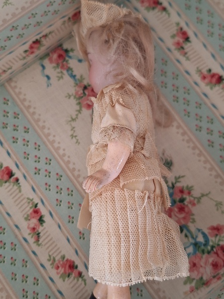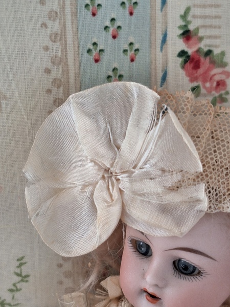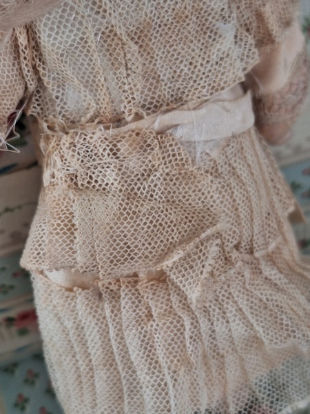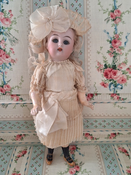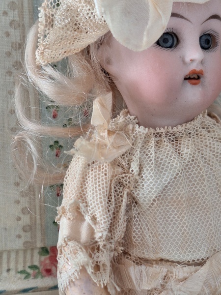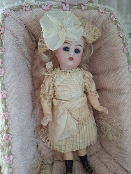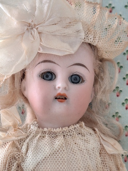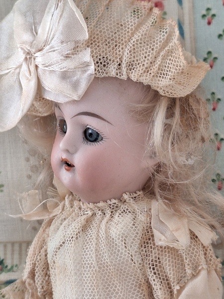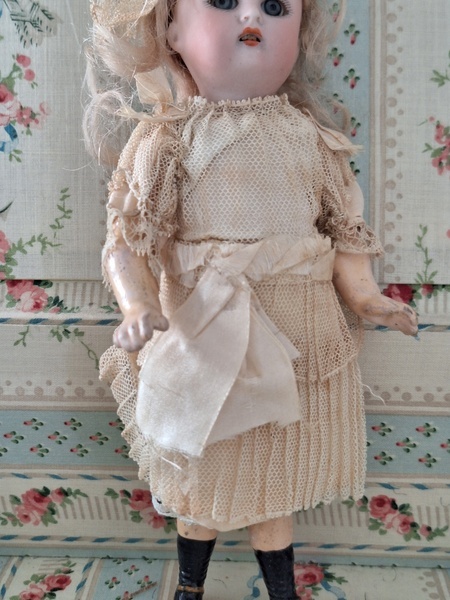 目はガラス製、オープンマウス、ヘッドはビスク製でボディはコンポジションです。手足、首はジョイントで動きます。今回もベルギーのディーラー様から譲っていただきました。彼女が長年お持ちだった子を譲ってくださいました。オリジナルのドレスがとても可愛いです。