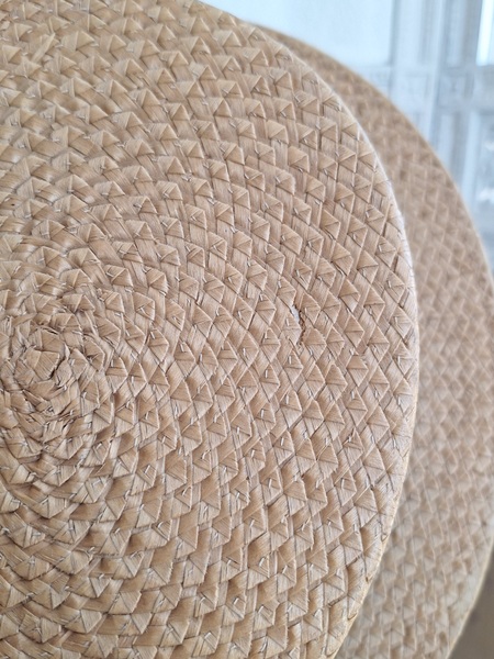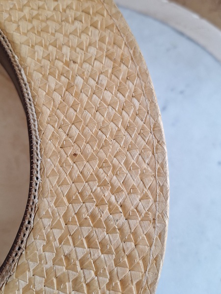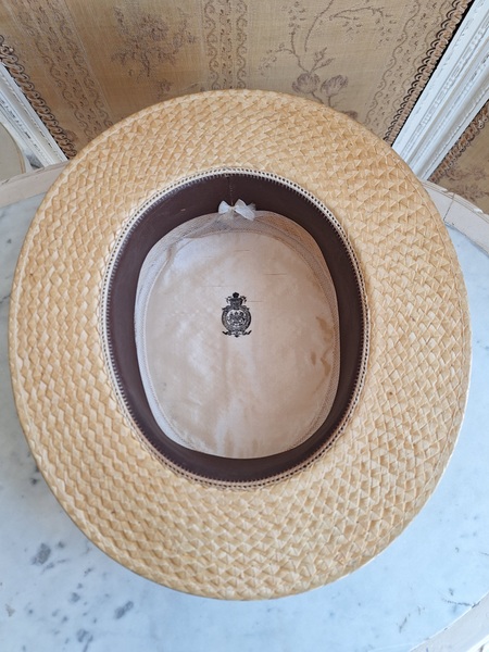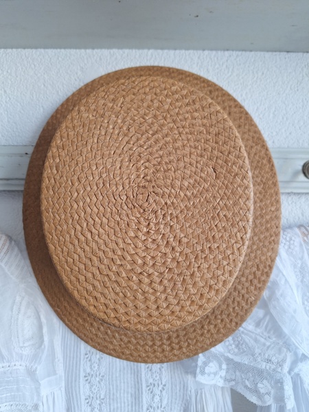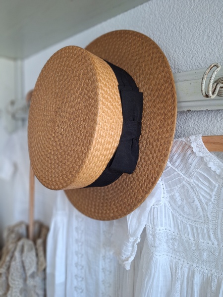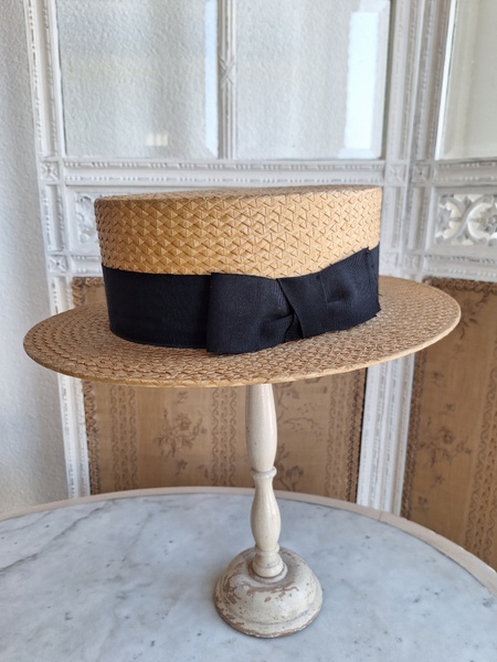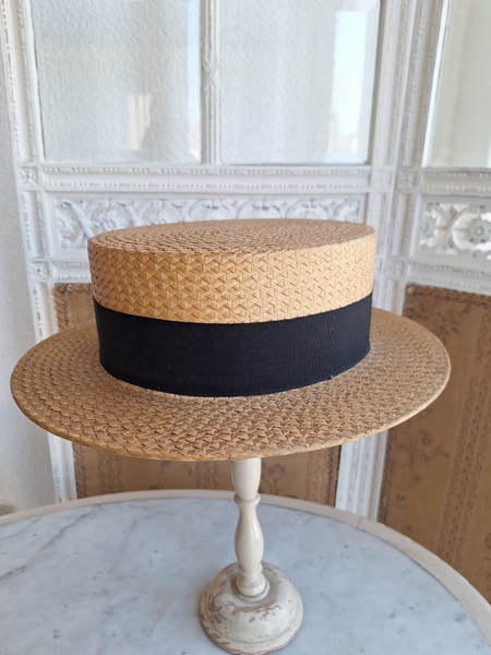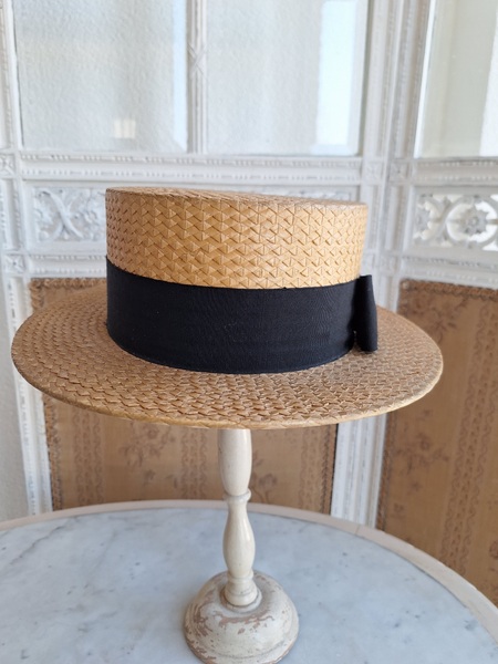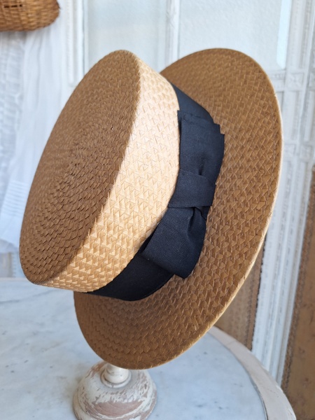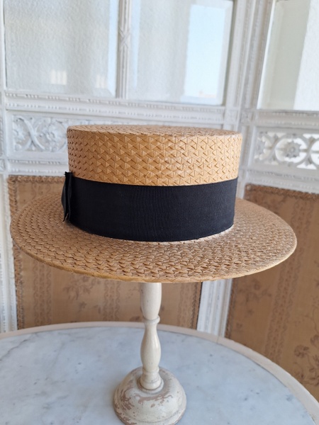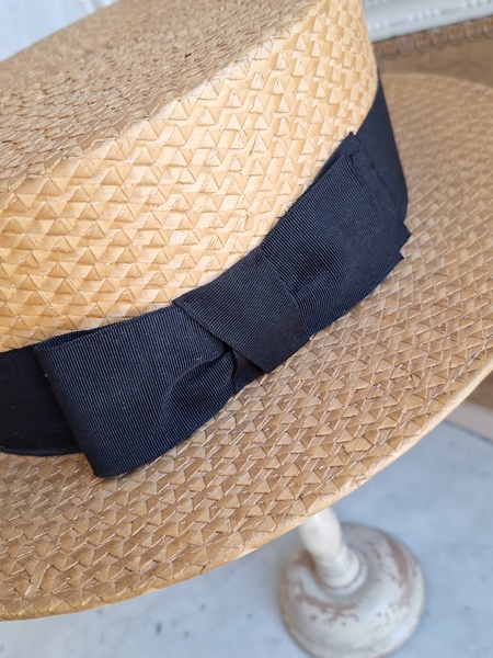 カンカン帽です。しっかりした造りです。内側に生地のほころび、最後のような痛みがありますが他、良い状態です。南フランスを旅しているとこのモデルのストローハットを被ってバカンスを楽しむヨーロッパ人を見かけます。これから暖かくなるのでリネンなどのドレスとコーディネートして南仏気分を味あわれても。フランス