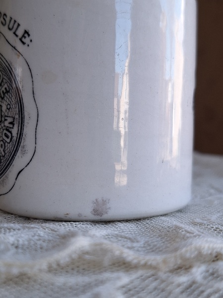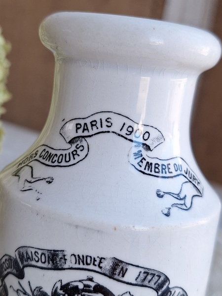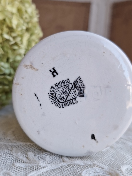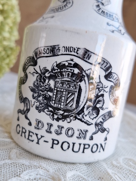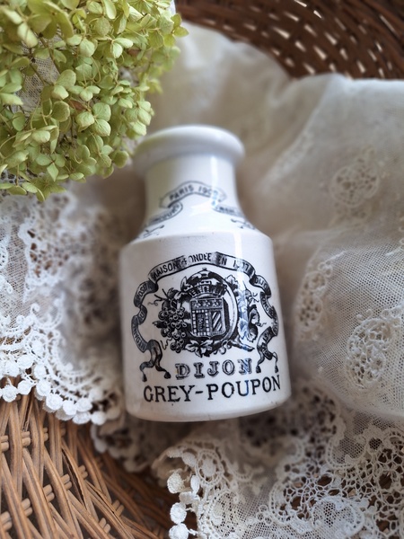 GREY POUPON/グレープポンマスタードポットです。サルグミンヌの物です。1777年創業のディジョンマスタード会社です。白地に黒いロゴがトレードマークのおしゃれなポットです。スプーンやペン立てにしたり、季節の草花など入れて楽しまれても。表面の小さな剥がれ、傷、若干貫入が見られます。年代を考えると良い状態と思います。フランスはもちろんヨーロッパ各国で高値でやり取りされています。見かける機会は結構あるのですが相場が高く、現地でこちらのお値段くらいで販売されています。比較的良い状態なのでこの価格ならお勧めだと思います。お探しの方はどうぞ。フランス製/1900年初頭