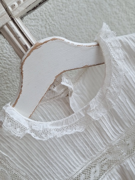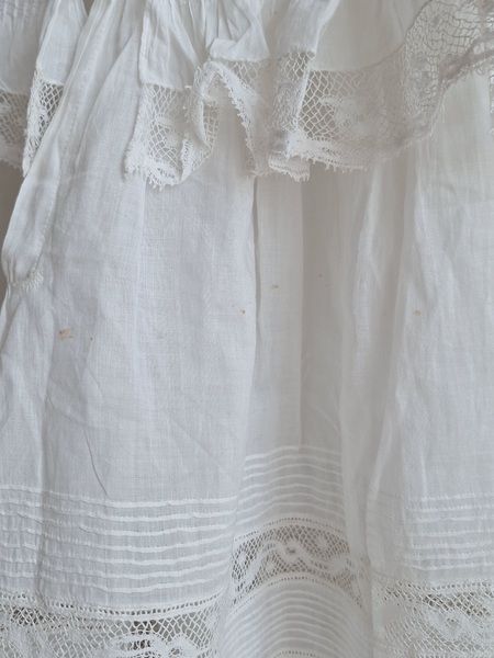 レースベビードレスです。レースたっぷり使われたベビードレスです。ドレスのフリル感が可愛いです。正面は良い状態ですが後ろ側の裾野レースにご覧のような小さなホール、背中の辺りにご覧のような小さな汚れがあります。こちらのような素材としてはとても良い状態です。フランス