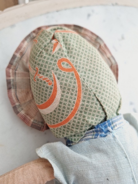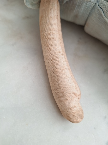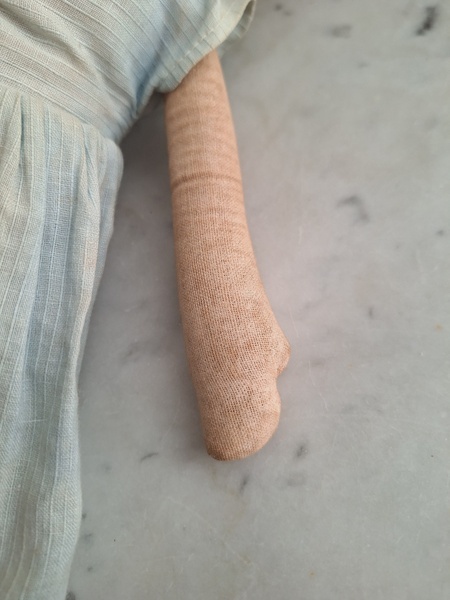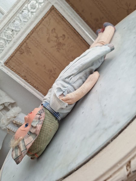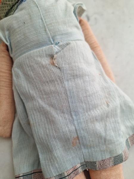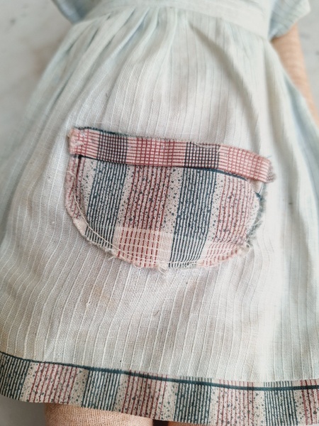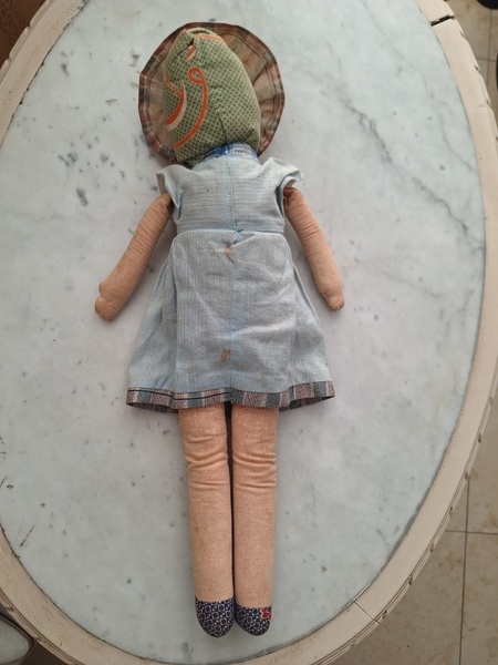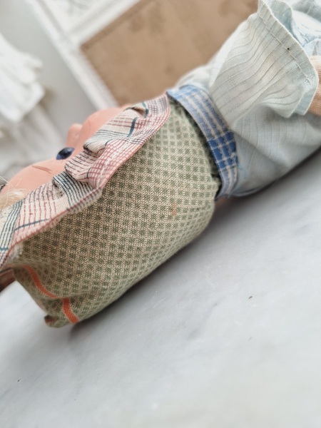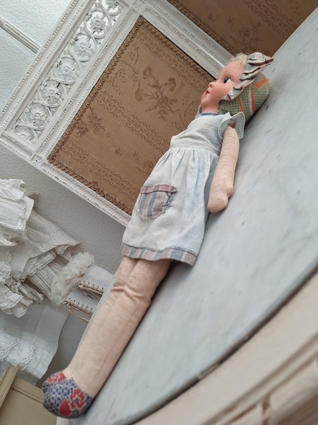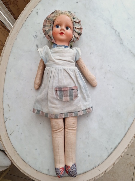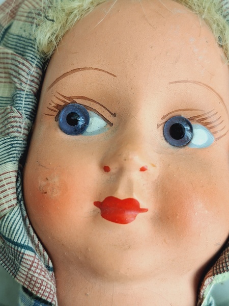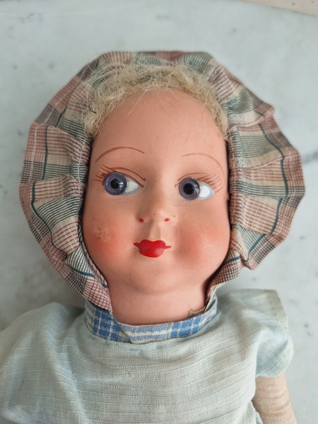 パピエマシェドールです。ブロンドにブルーの瞳が可愛いドールです。目はプラスチック製です。ボディは藁が入っています。頬に少し汚れがありますが良い状態と思います。フランス