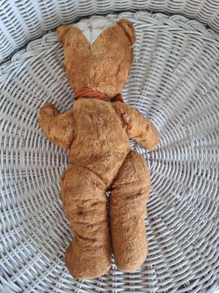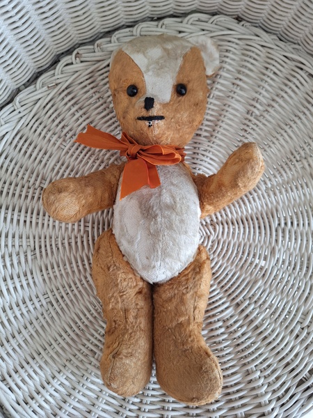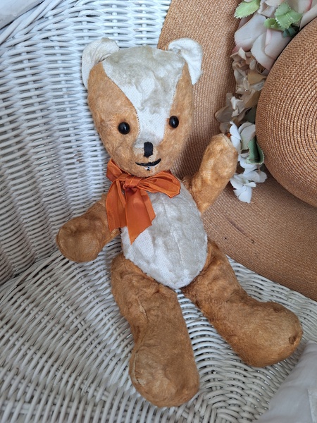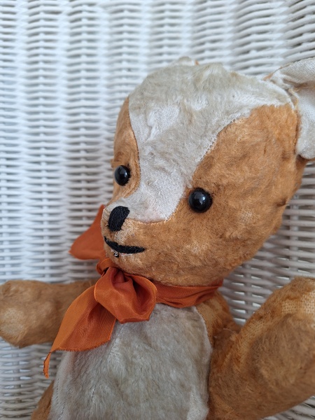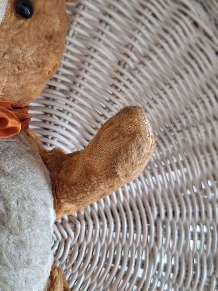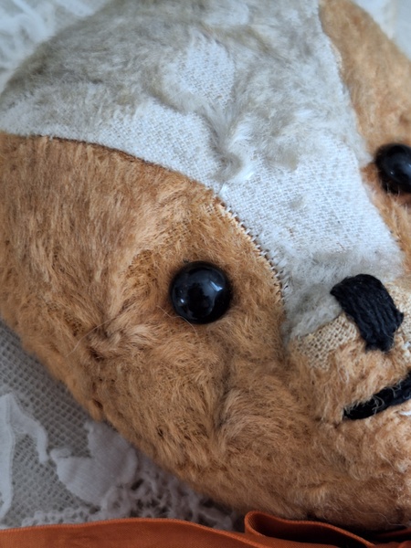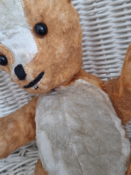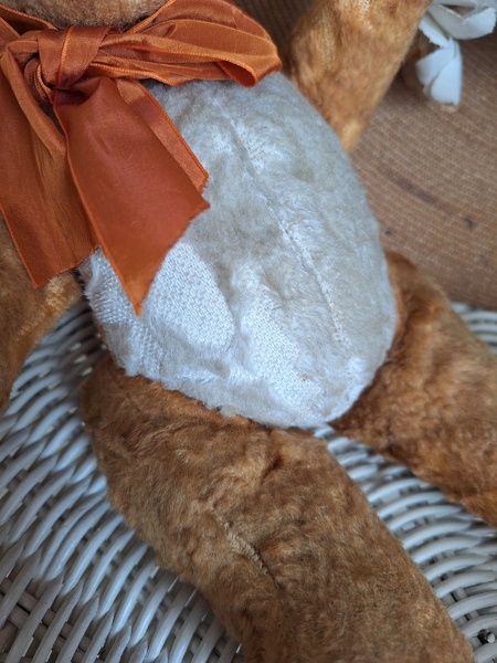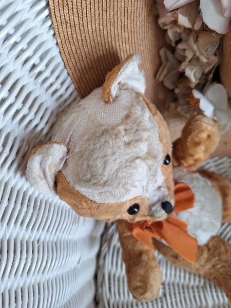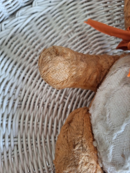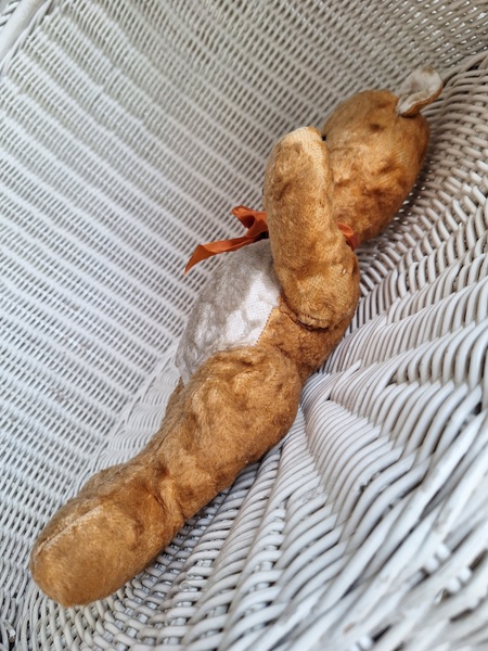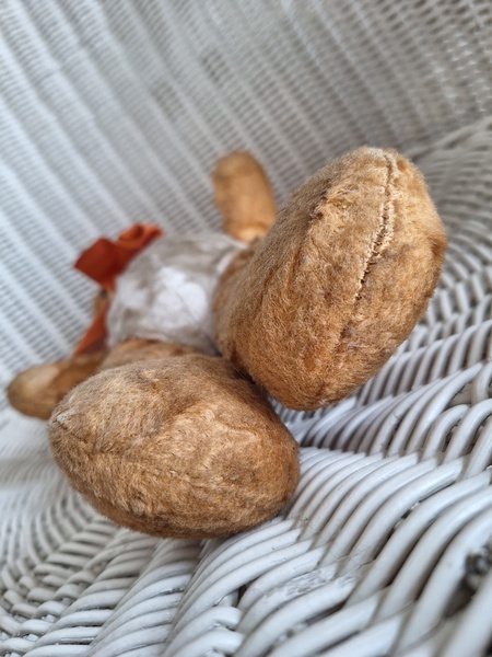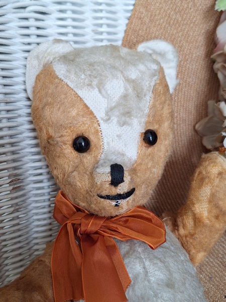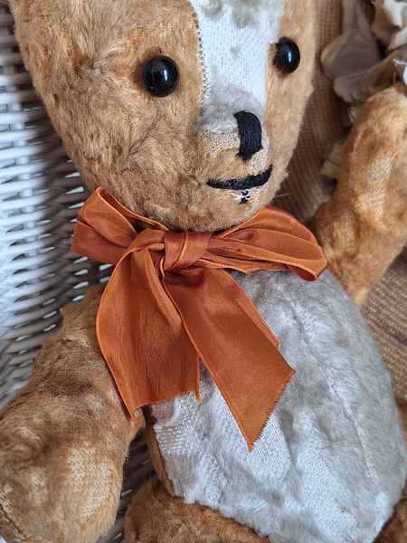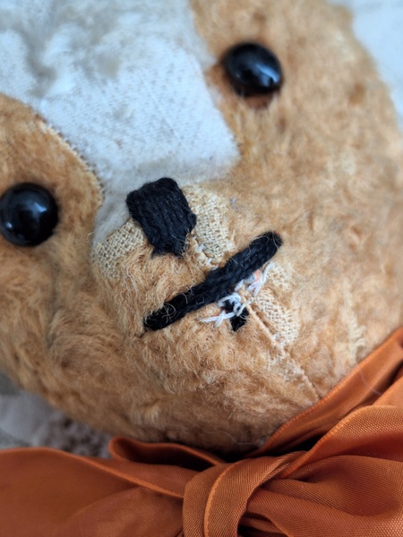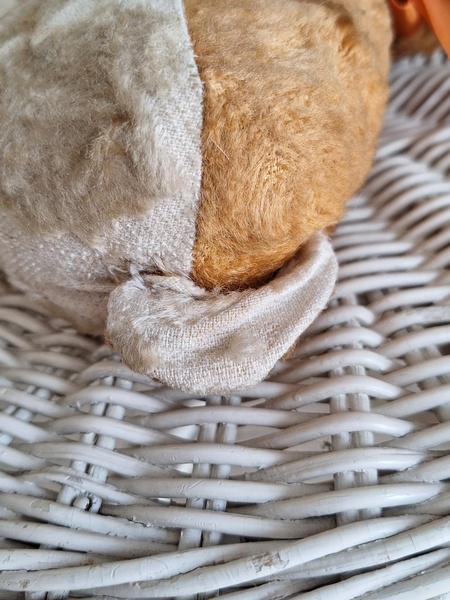 フレンチテディベアです。鼻と口の刺繍は後年、刺し直されています。目はガラス製です。中は藁です。手脚はジョイントで動きますが経年で動きにくくなっています。オレンジとホワイトの組み合わせが可愛いベアです。恐らくJPMの子ではないかと思いますが、フランス製は間違いありません。最後の画像ですが首の辺りの藁が乾いて詰め物が少なくなっているような状態です。首がしっかりしていません。クタクタ感のある子がお好きな方に。フランス製