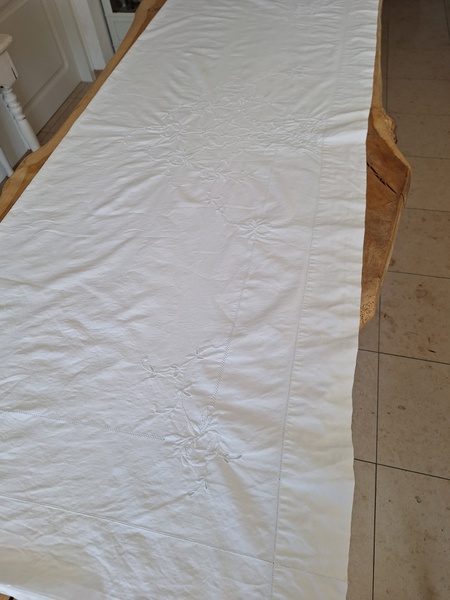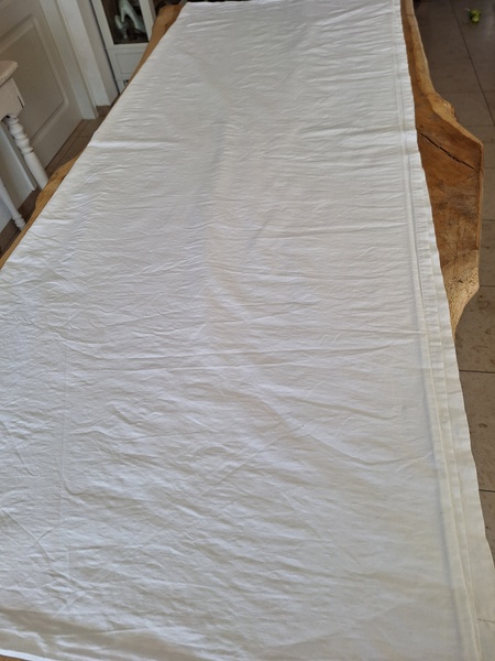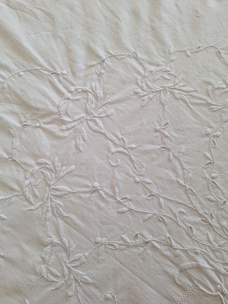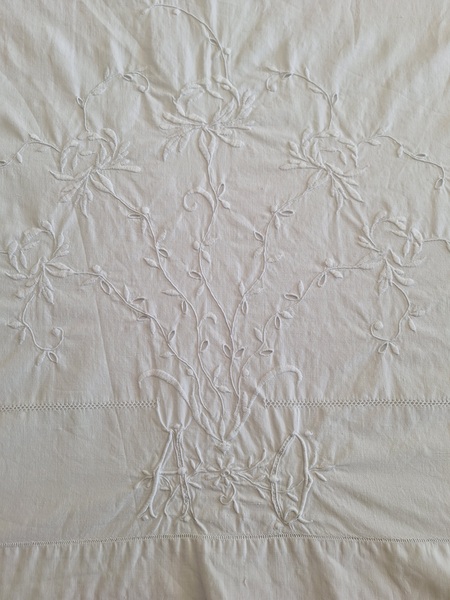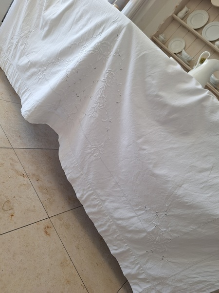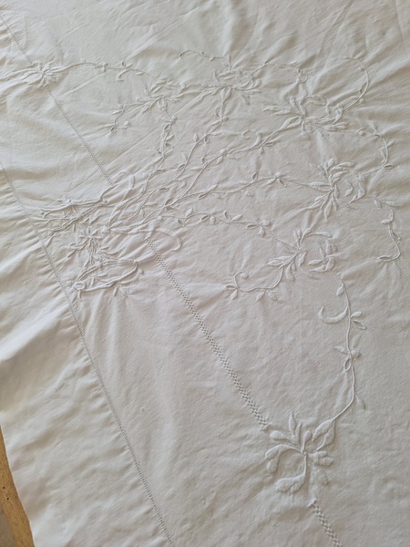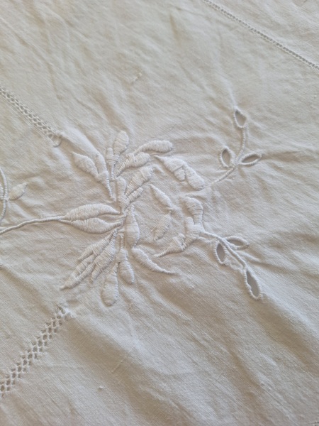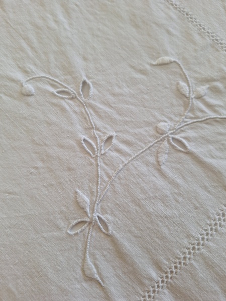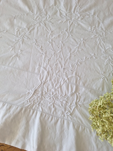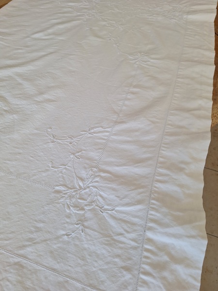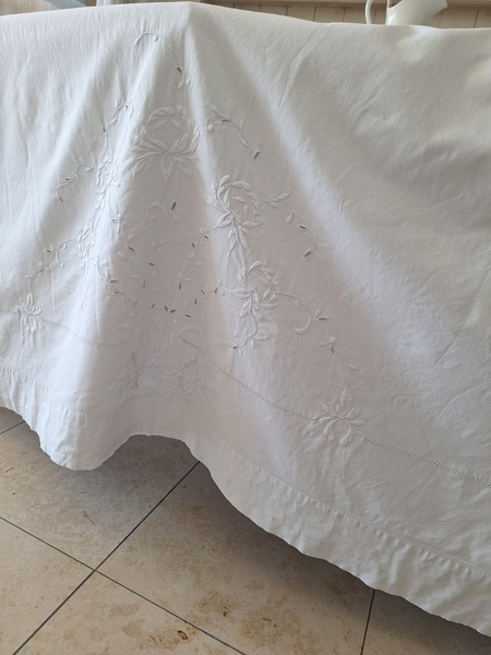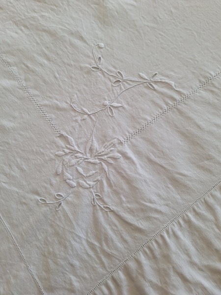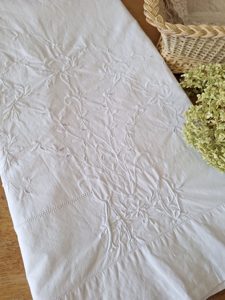 モノグラムリネンシーツです。イニシャルはAOです。通常、イニシャルの辺りの刺繍はモノグラムの辺りだけが多いのですがこちらはご覧のように比較的、イニシャルの辺りに大きな花の刺繍がされています。テーブルに置いている画像12.13枚目は縦を4つ折りにしています。1/4程度の真ん中にイニシャルと花柄が大きく入っています。一度、お洗濯していますので綺麗な状態です。フランス