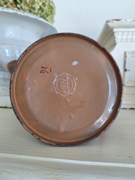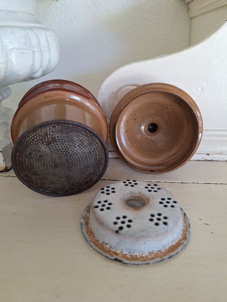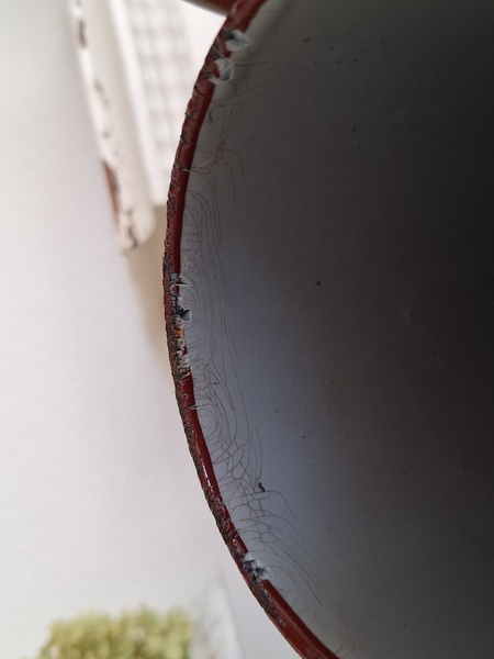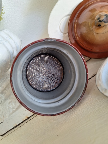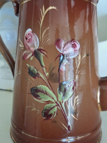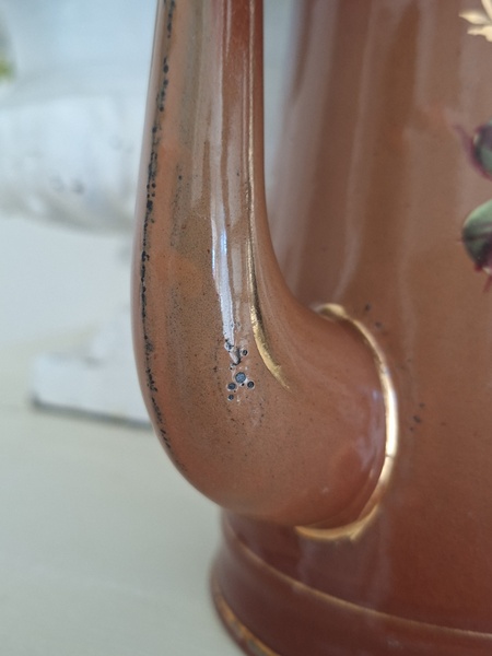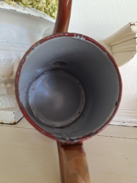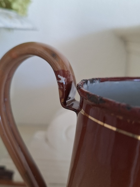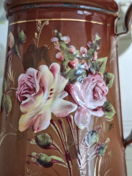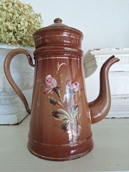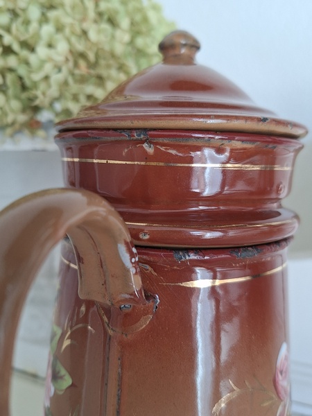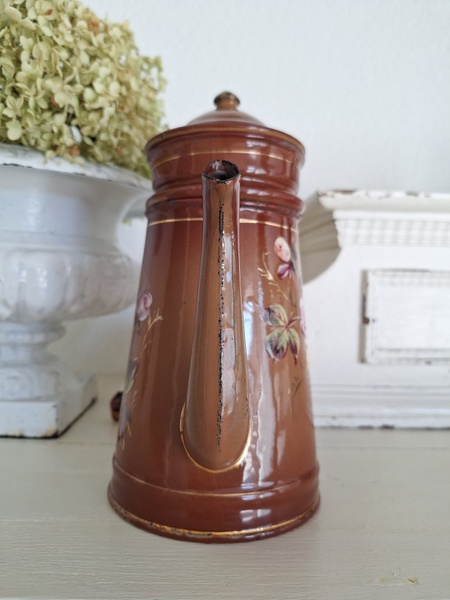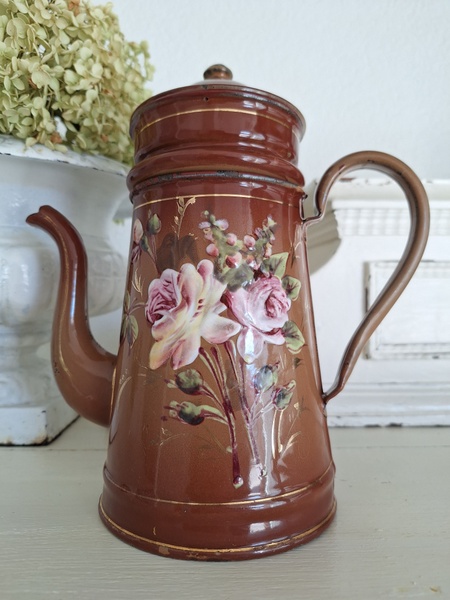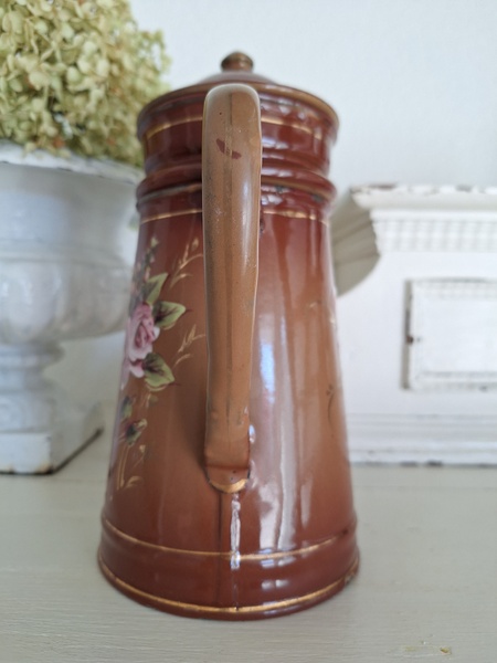 ホーロー手描きローズ柄コーヒーポットです。ブラウンにピンクのバラのコントラストが美しいポットです。ブラウンのホーローは地味なイメージがをお持ちの方も多いのですがアースカラーでカントリースタイルやパインの家具にも合うお色で特に手描きの柄を引き立ててくれるお色でもあり、個人的に好きでブラウンの手描きのホーローも持っています。ヨーロッパのホーローコレクターさんと先日お話ししましたが彼も同じようにおっしゃられていました。見た目ではあまり分からないのですが22センチ程度の小ぶりのポットで外観は艶があり、柄も綺麗の残っていて目立った痛みも無くお勧め、美品です。刻印が入っているのですが全部読み取れませんがフランスでの買い付け。