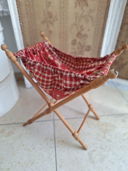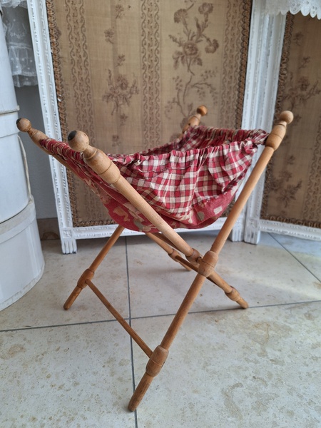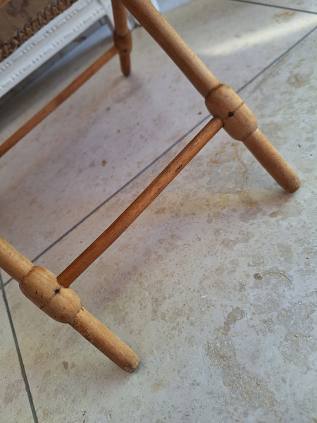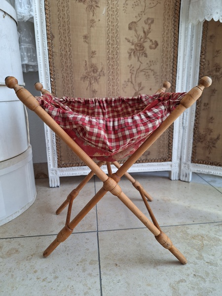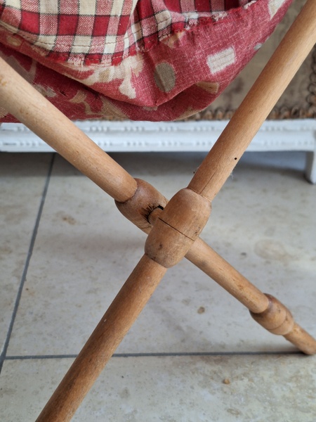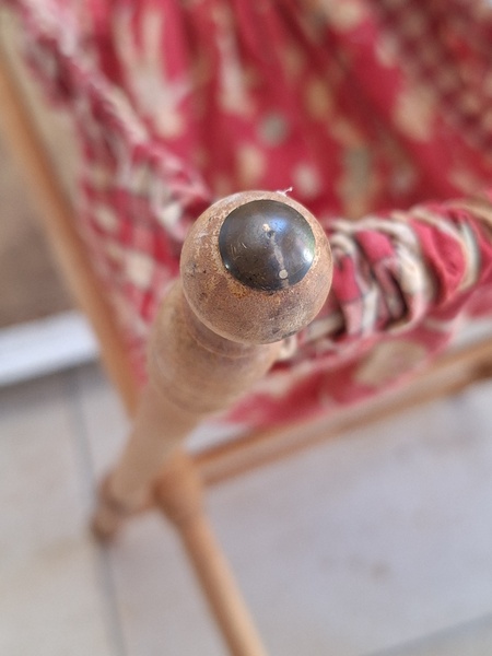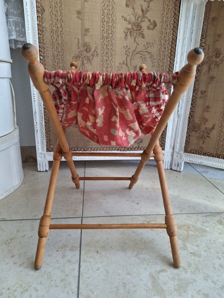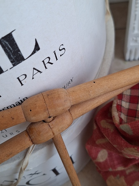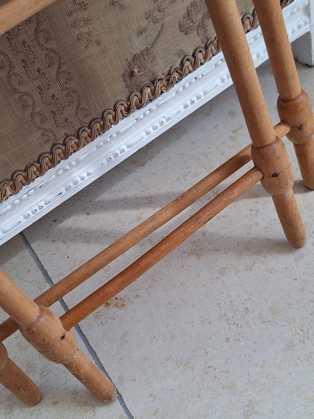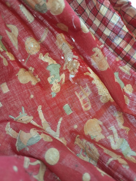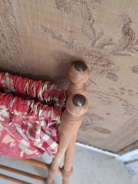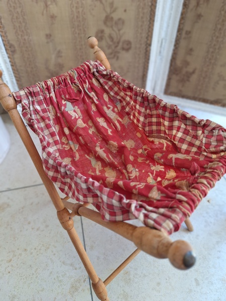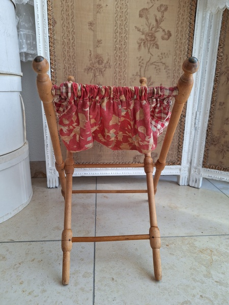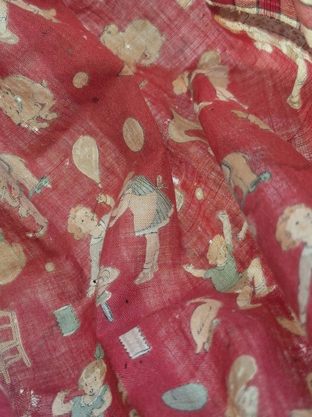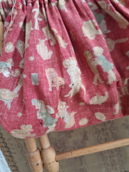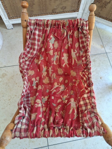 チャイルドトラバイユーズです。可愛いらしい子供柄の生地が使われていますがご覧のように所々痛んでいますのでラックのお値段程度にしています。生地に下地を付けてアレンジされたり、ラックを使って生地を取り付けられても。小さな虫食いが見られますが買い付けしてから2か月ほど様子を見て販売していますのでご安心ください。この持ち主は上から見て生地が表になるように作られていますね。フランス
