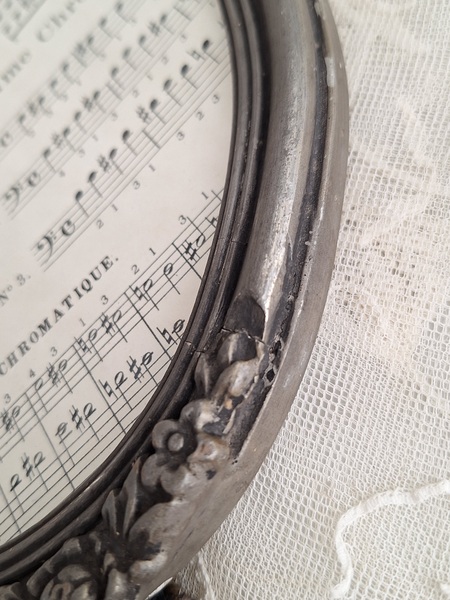 アンティーク額です。ゴールドの額が多いのですがこちらはシルバー系のグレーで落ち着いた雰囲気です。木製で表面は石膏です。最後のように石膏にヒビが入っている箇所がありますが貫通していません。額に多いコンディションです。ご使用には問題ありません。フランス