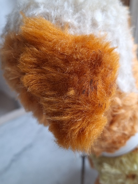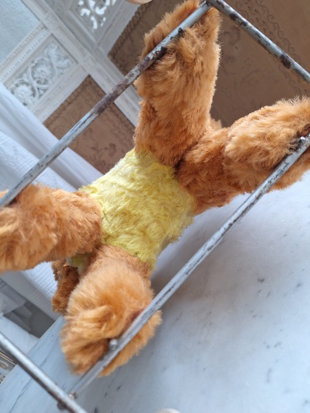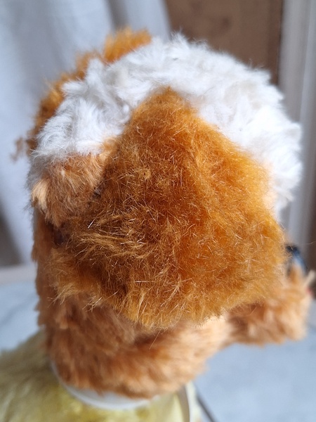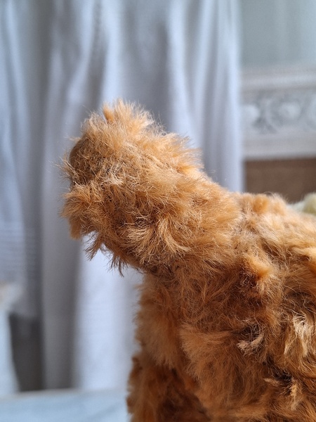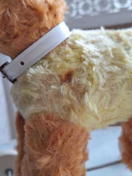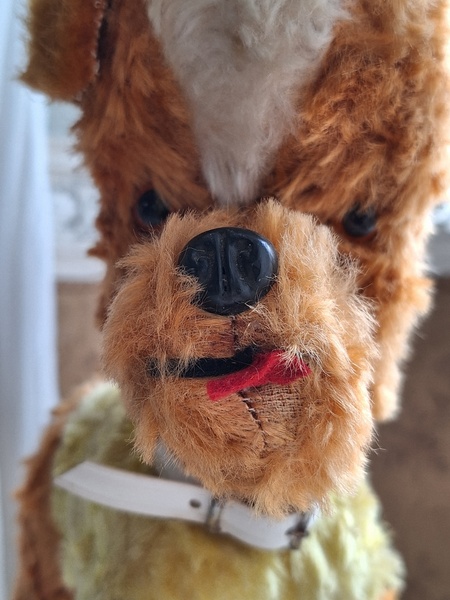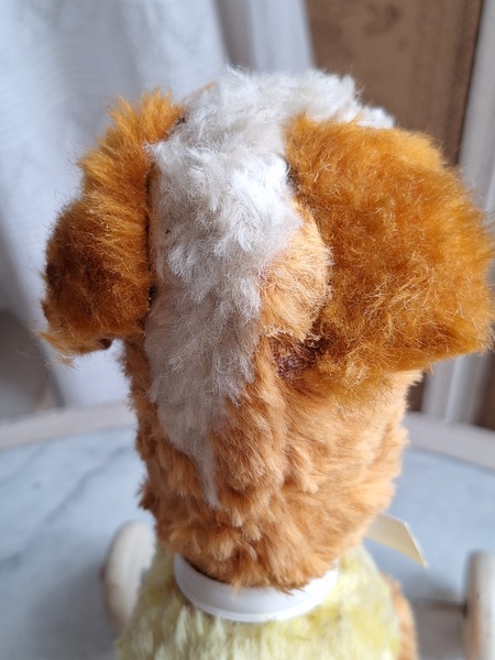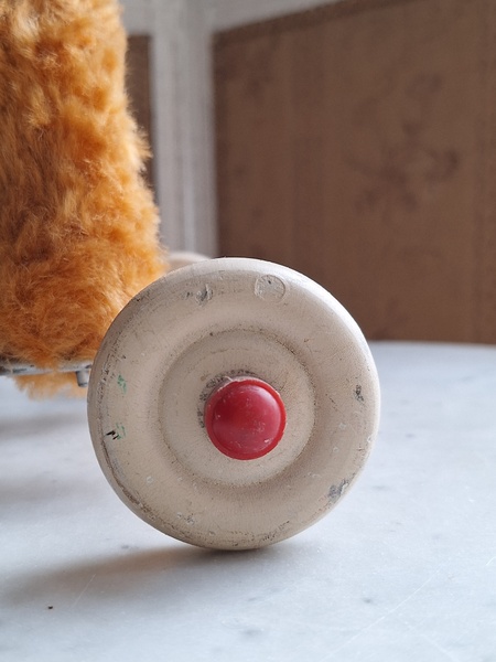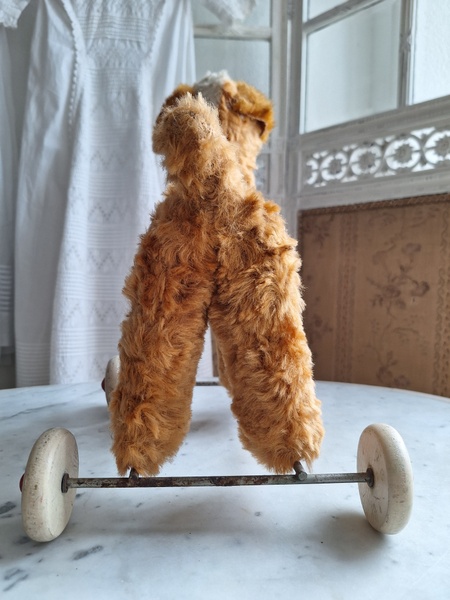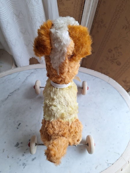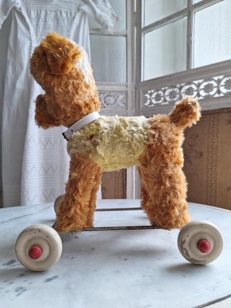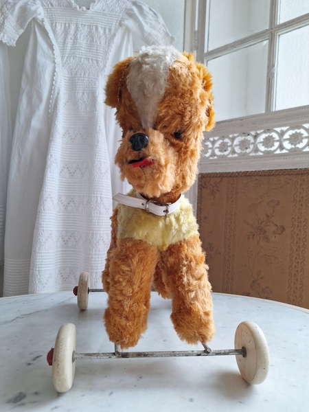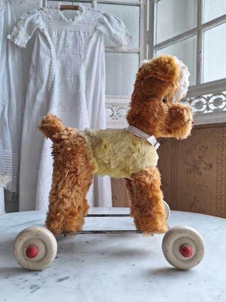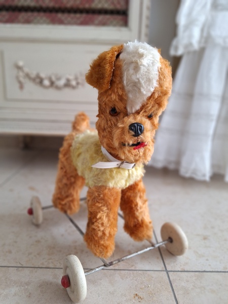 車輪付きワンちゃんです。車輪は木製です。目はガラス製、中は藁です。車輪はヒビなど無く良い状態ですが耳は後年、同じ生地でアレンジされているようです。違和感はないです。車輪付きのアニマルは高額でやり取りされていますのでこちらのお値段だとお買い得だと思います。フランス