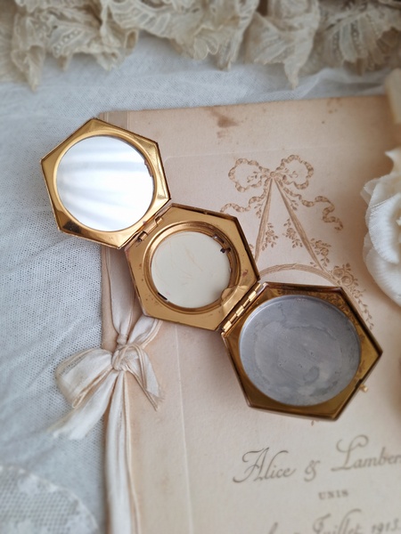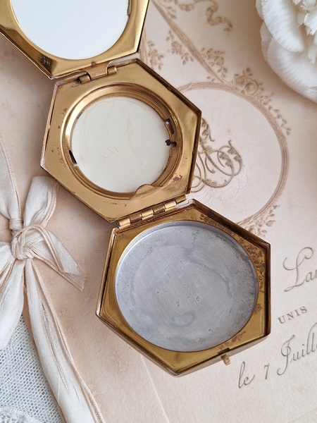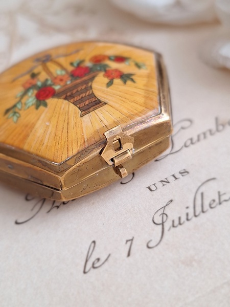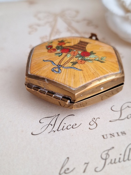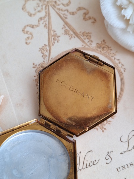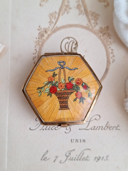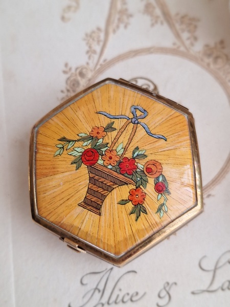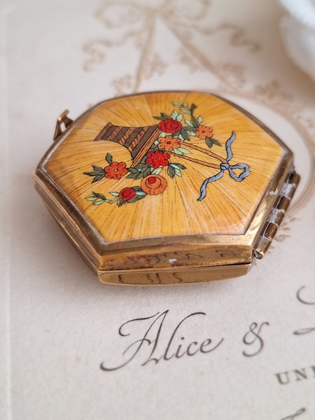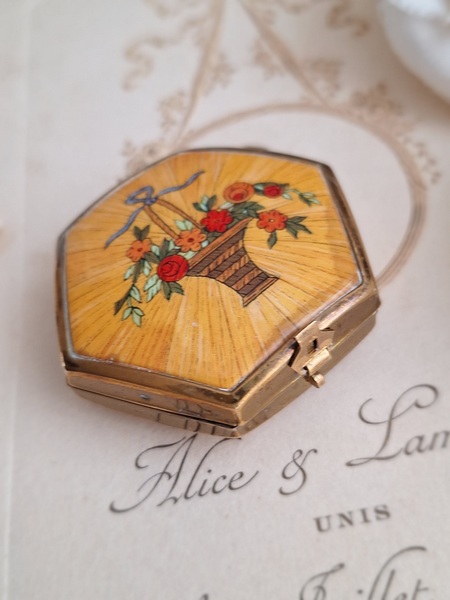 Houbigant花かご柄コンパクトです。パウダーボックスは何度か扱った事がありますがウビガン社のコンパクトです。アートデコデザインの印象的な柄ですね。向かって右下に若干シミが見られますが他、良い状態と思います。香水などをコレクションされている方はコスメアイテムでコレクションされてはと思います。アンティークなのでリフィルはもちろんないので使えませんがロケットペンダント感覚で中に大切な物を保管されても。私はこのコンパクトの中に台紙に貼った生地かレースなどをリフィルする箇所に入れてアレンジしようかなと思っていました。フランス製/1930年代