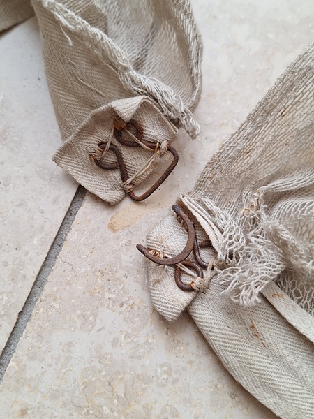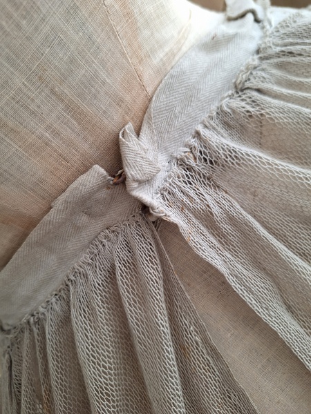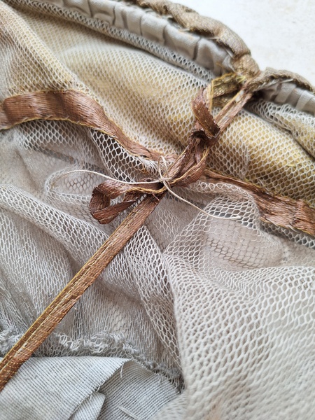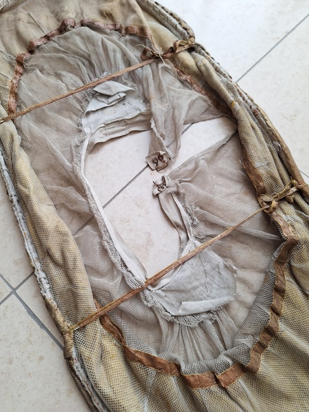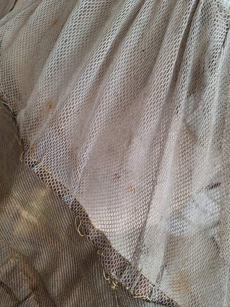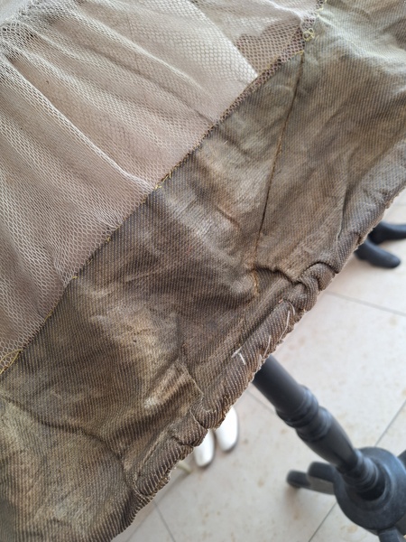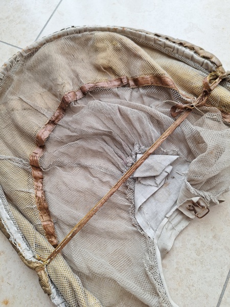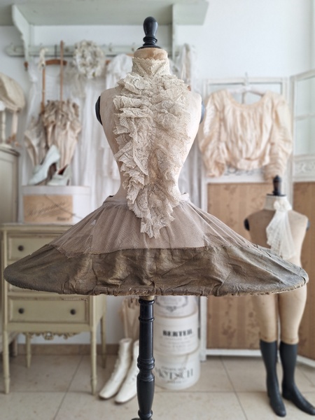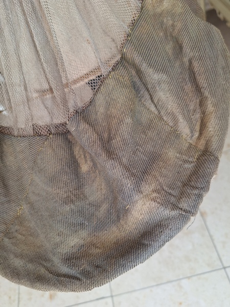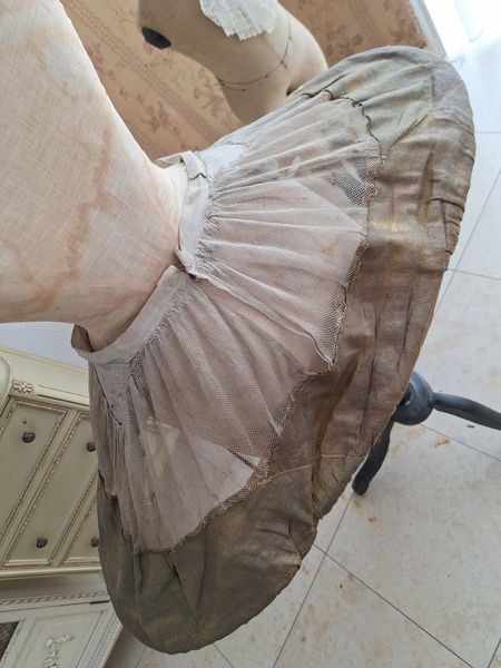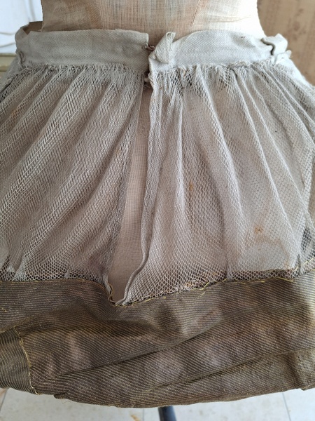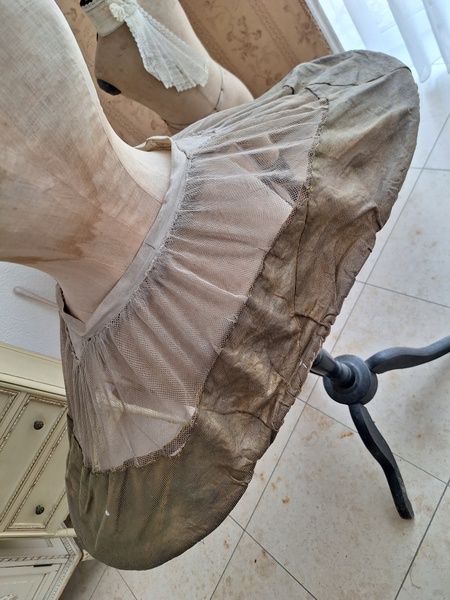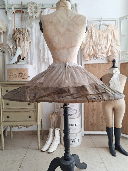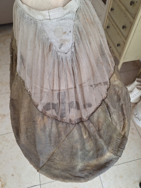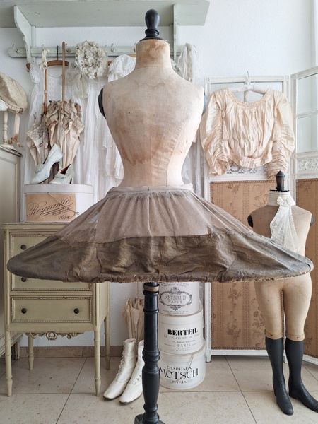ヴィクトリアン期ワイドフープクリノリン/antique panierです。大変古いクリノリンです。20世紀に入ってからのクリノリンと異なり、幅が広く奥行きが狭いのが特徴です。年代を考えると大きな痛みも無く良い状態と思います。元々グリーンのようなブラウン系の生地が下の方に使われています。ベージュ生地のトルソーと飾られるとコントラストも綺麗で素敵ですよ。クリノリンの裏の紐を糸で簡単に留めています。留めていないと飾った時にこの紐が見えてしまいます。気になる方はご自身で調整ください。以前、ネット見かけて私も気になっていたアイテム。キーワード検索、ピンタレストなどネット上でも検索結果がほとんど出て来ないほど貴重なお品です。個人的にもこのフォルムの物は持っていますが生地付きで雰囲気あります。ヨーロッパのファッションアイテムコレクターさんが探していますのでなかなか見つかりません。これを見つけた時に一足早くフランス人女性がバッスルや別のモデルのパ二エ買われてしまいました。恐らく古いアトリエから出て来た物と思います。完品であれば当店の価格以上で販売されているお品です。フランス製