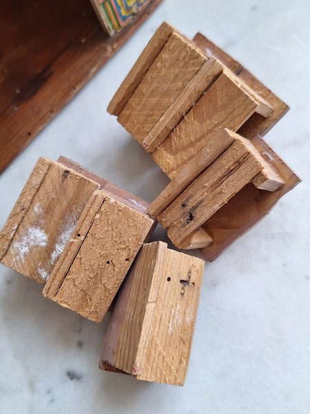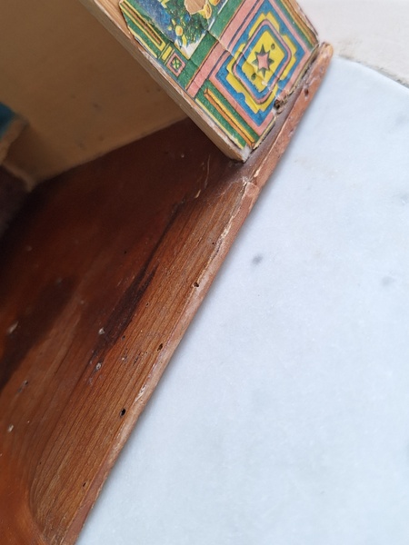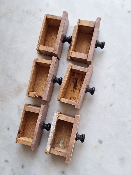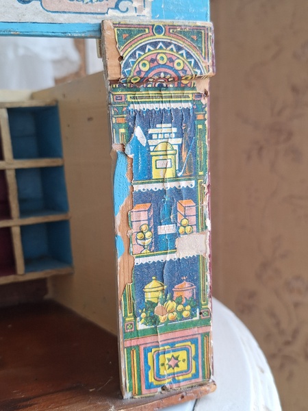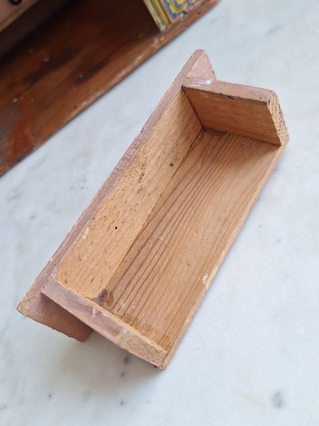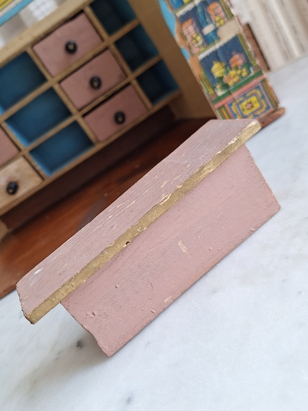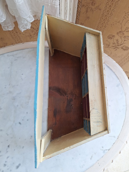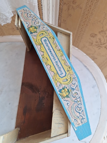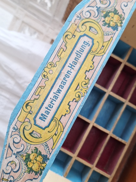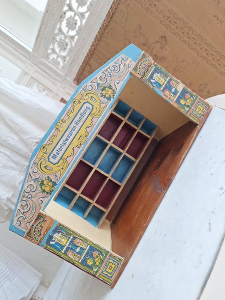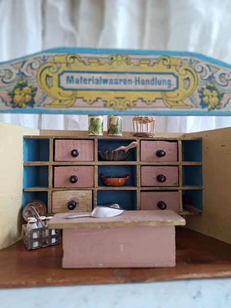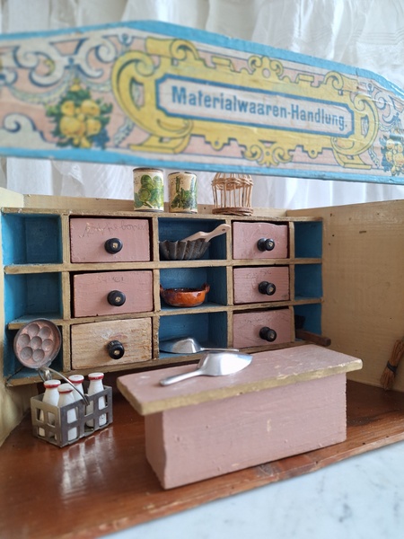 アンティークトイショップです。文字はドイツ語です。ショップの素材は木製です。小物付きです。看板は外せるようになっています。看板を固定するパーツが後年、補修されていますが正面からは分かりません。引き出しは若干虫食いが見らラれますが2か月様子を見て販売していますのでご安心ください。このくらいの小さなサイズは現地のコレクターさんが好みますのでほとんど出て来ません。サイズ感が可愛くてお勧めですよ。100年くらい前のお品です。トイショップももう見かけなくなりましたし、見かけてもお値段がかなり高くて、買い付け出来る物が少なくなりました。お探しの方はどうぞ。ドイツ製