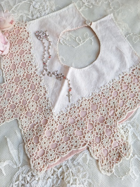 クロッシェ編みレ―ススタイです。ピンク地にベージュのレースのコントラストが素敵です。レースに若干色あせあります。痛みなどはなく良い状態です。フランス/1940年代ごろ