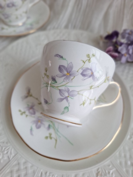 英国製Winchesterすみれ柄カップ&ソーサーです。コーヒーカップです。陶器のすみれ柄と言うとロイヤルアルバートやリモージュでも結構濃い目のすみれのお色が多いのですがこちらは優しい色合いで気に入りました。内側にも柄が入っています。チップやヒビはありませんがBの在庫のソーサーの真ん中あたりに落ちない黒い小さな汚れがあります。他、ゴールドのリムも綺麗に残っていて使用感が感じられない良い状態のお品です。イギリス製/1950年代