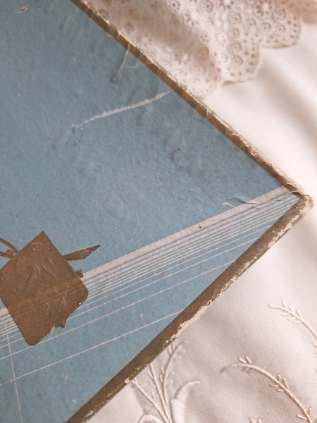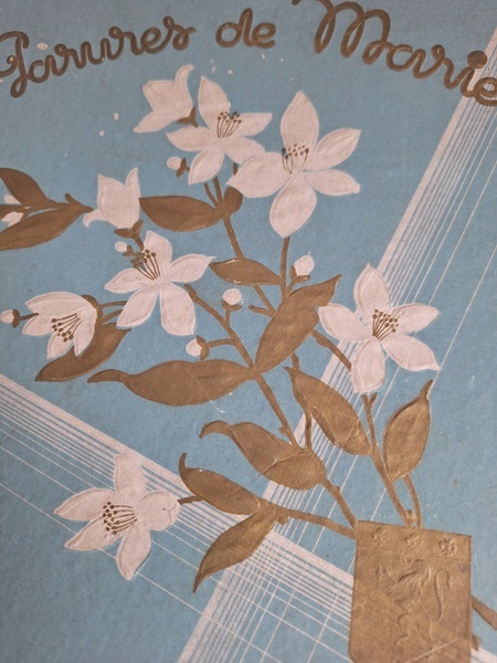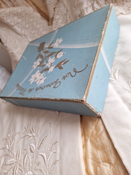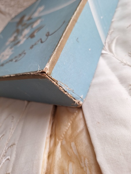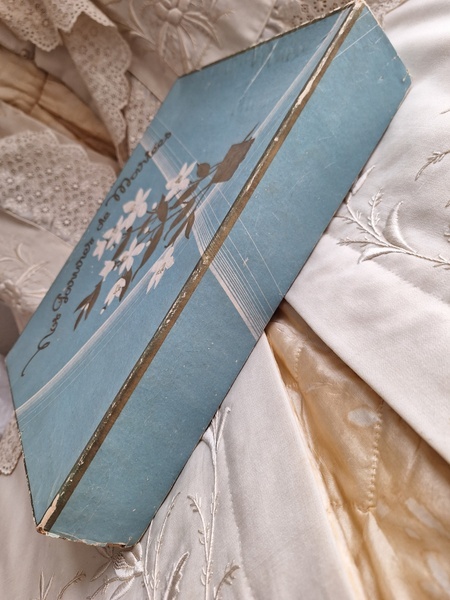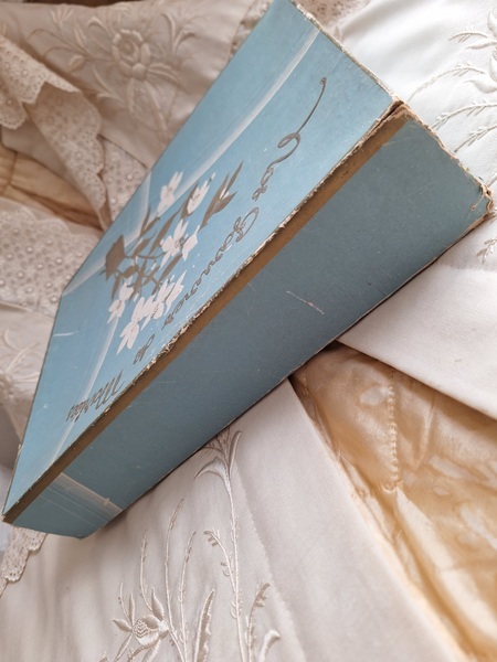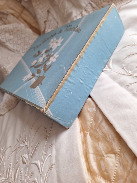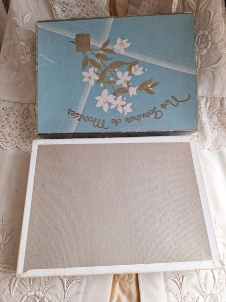 グローブドマリエ紙箱/ワックスフラワーティアラボックスです。ワックスフラワーやウエディングベールが入っていたボックスです。ブルーにゴールドの文字、白いユリの花が入っています。ゆりの花は純潔、謙虚さ、優しい心と美のシンボルとされています。ヨーロッパではこのボックスだけでもお好きな方が多く、コレクションされていらっしゃいます。すでにワックスをお持ちの方はこのボックスに保管されてみてもと思います。